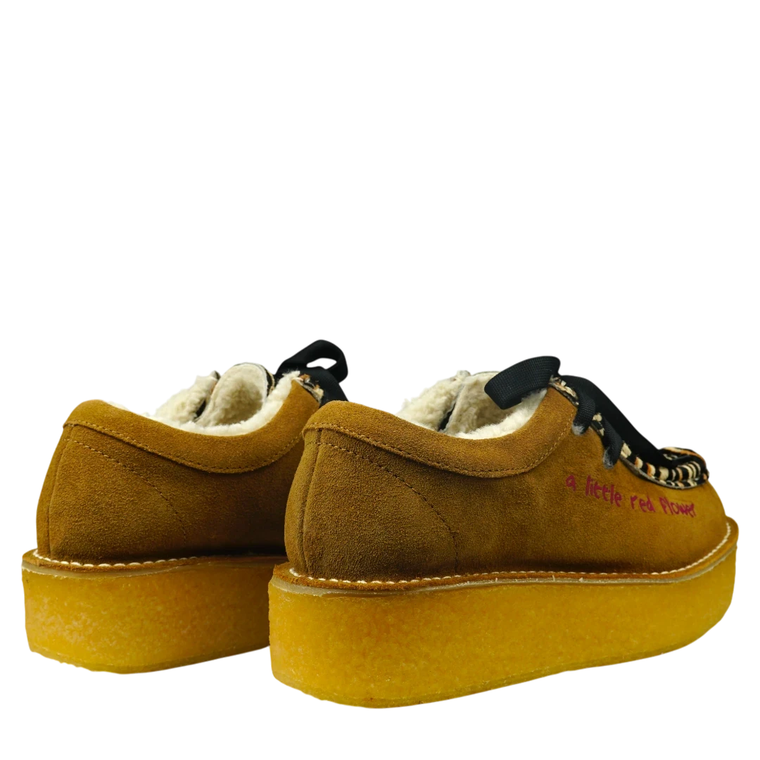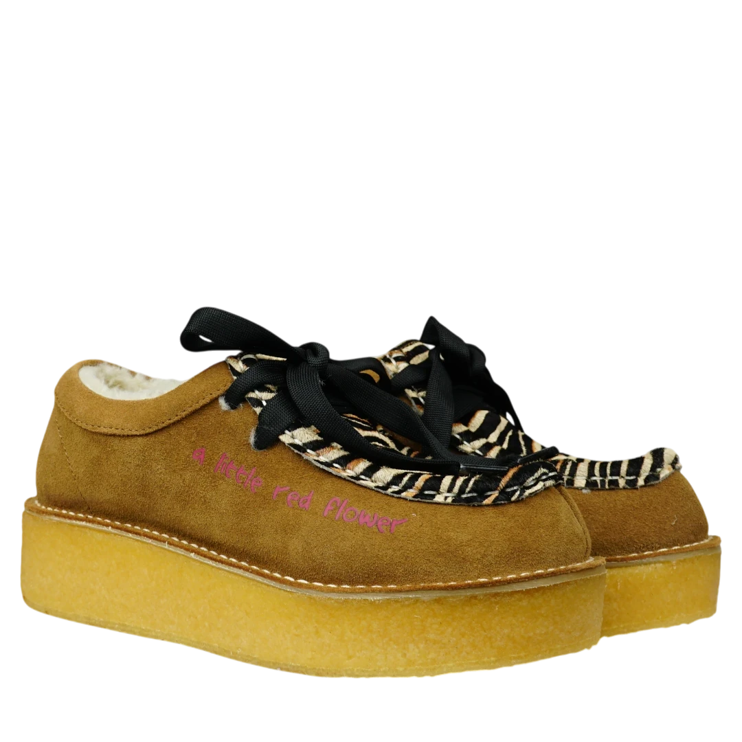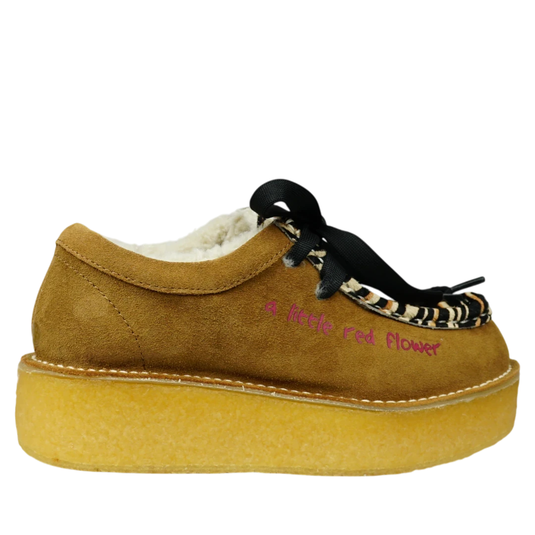 Ove Nanku cipele unose toplinu, udobnost i unikatnost u svaku modnu kombinaciju. Izrađene od meke brušene kože u toploj smeđoj nijansi, krase ih kontrastni detalji s animal printom i natpis “a little red flower” koji dodaje prepoznatljiv umjetnički pečat brenda. Crna satenska pertla unosi dašak ženstvenosti, dok mekana unutrašnjost s krznom pruža izuzetnu udobnost i toplinu. Deblji gumeni đon u boji meda osigurava stabilnost i lagan korak. Idealne za one koji vole opušten, ali izražajan stil s notom boho šarma.
