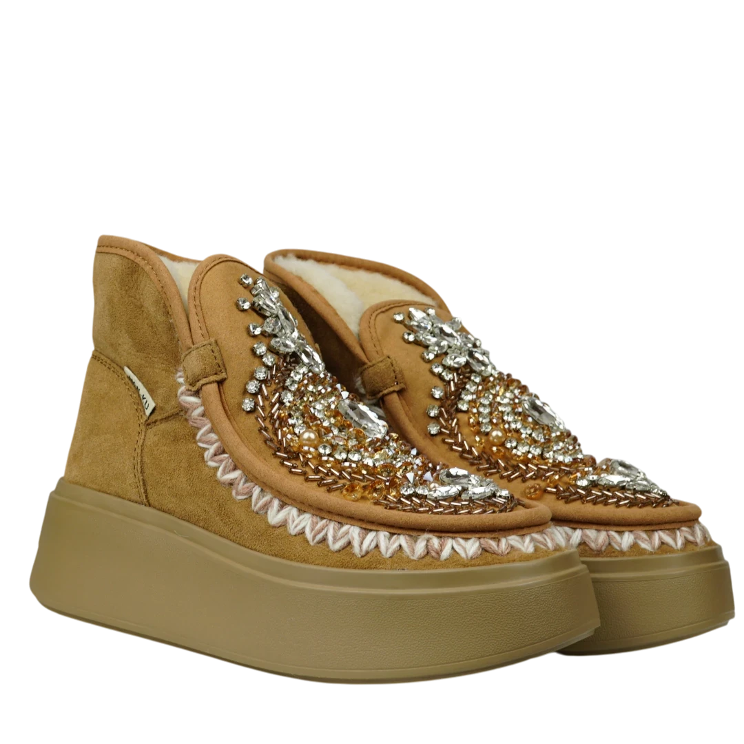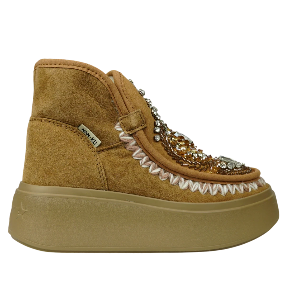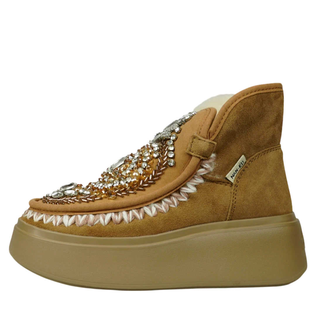 Ove Nanku gležnjače u toploj camel nijansi odišu luksuznom udobnošću i prepoznatljivim zimskim šarmom. Izrađene od meke brušene kože, obložene su bogatim krznom iznutra, dok su sjajne kristalne aplikacije i ručno vezeni detalji na prednjem dijelu ono što im daje poseban, ženstven pečat. Povišeni gumeni đon pruža udobnost i stabilnost, savršenu za svakodnevno nošenje tokom hladnih dana. Ovaj model spaja eleganciju i cozy stil, čineći ga idealnim izborom za moderne žene koje žele izgledati dotjerano, ali se osjećati potpuno opušteno – bilo uz traperice, pletivo ili ležerni kaput.