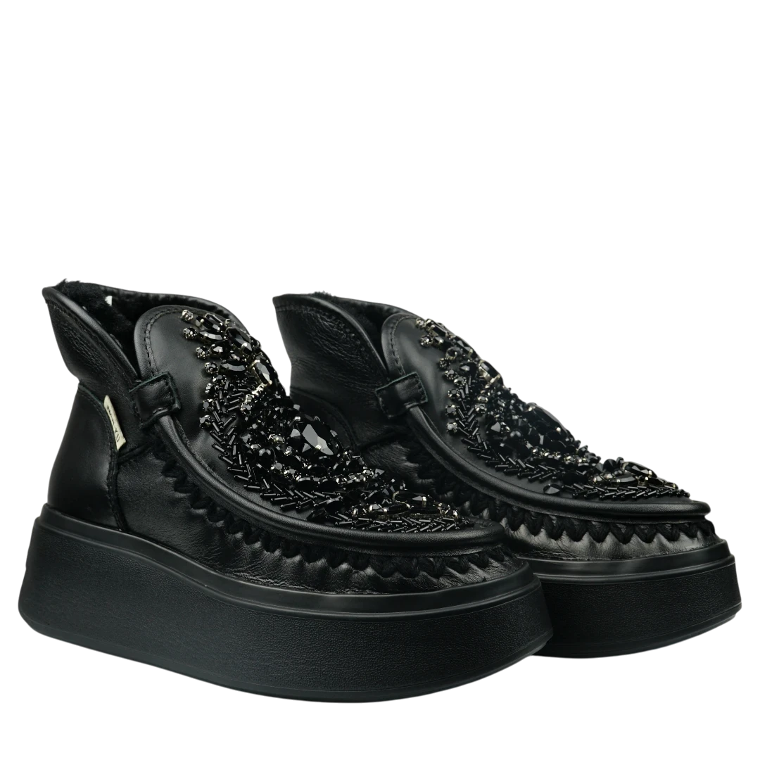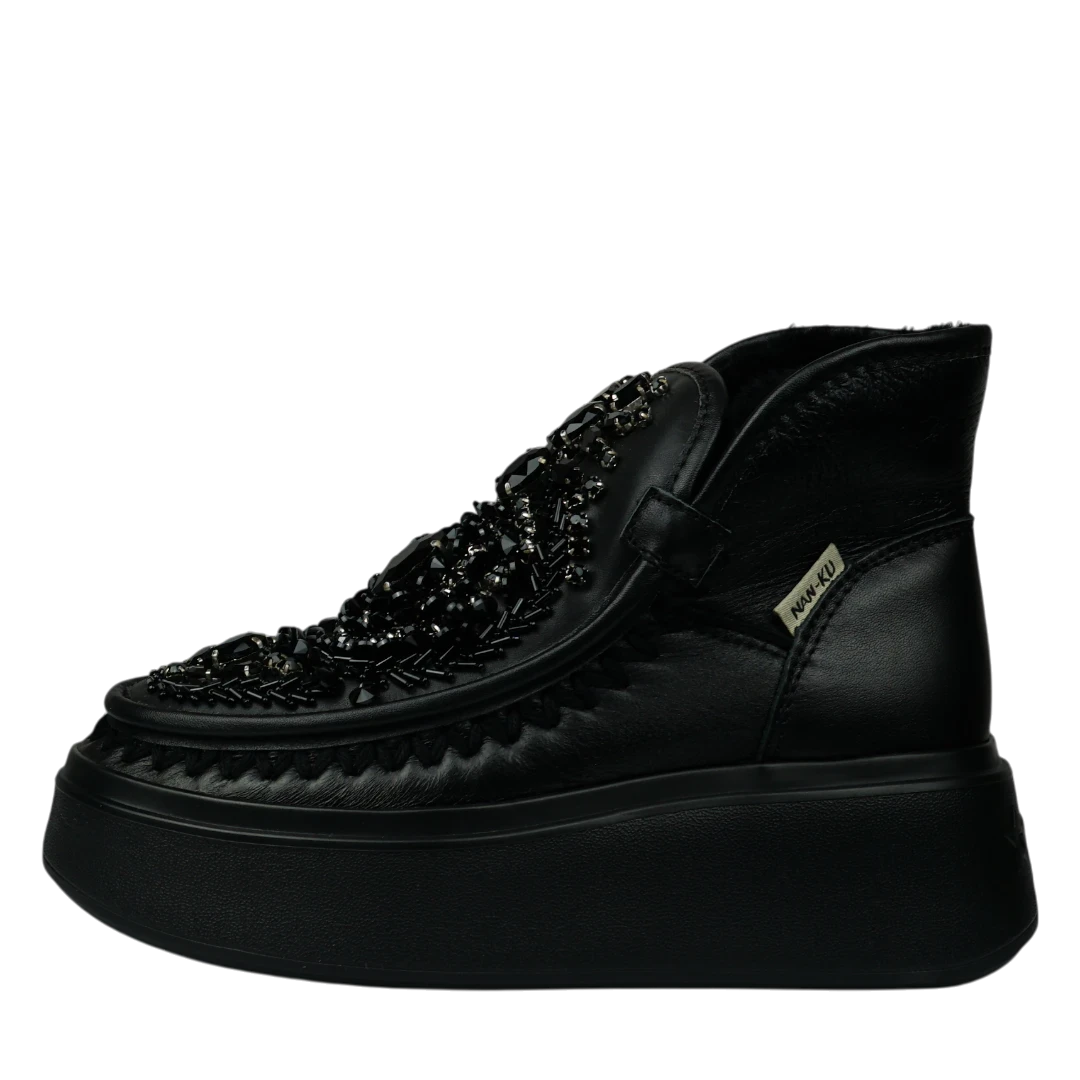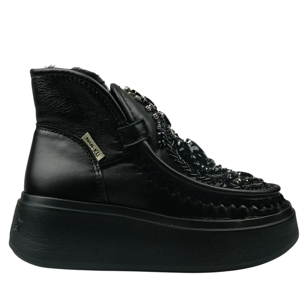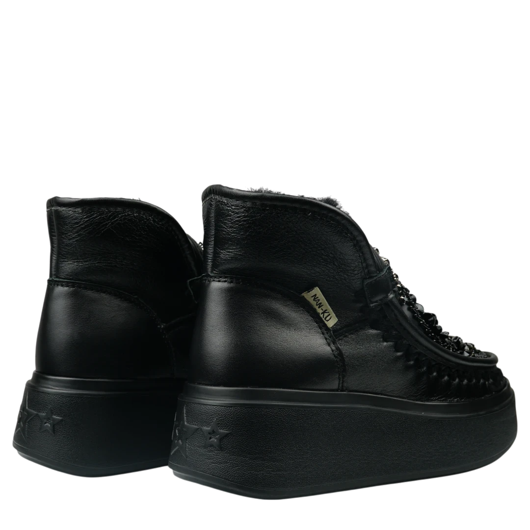 Ove Nanku gležnjače spajaju udobnost, toplinu i prepoznatljiv urbani stil. Izrađene od mekane crne kože, s unutrašnjošću obloženom krznom za dodatnu toplinu, idealne su za hladnije dane. Ukrasni detalji s sjajnim kamenčićima i ručnim šavovima daju im luksuzan, ali moderan izgled, dok povišeni gumeni đon pruža stabilnost i lakoću pri hodu. Savršene su za one koji žele da njihova zimska obuća bude istovremeno udobna, elegantna i efektna.