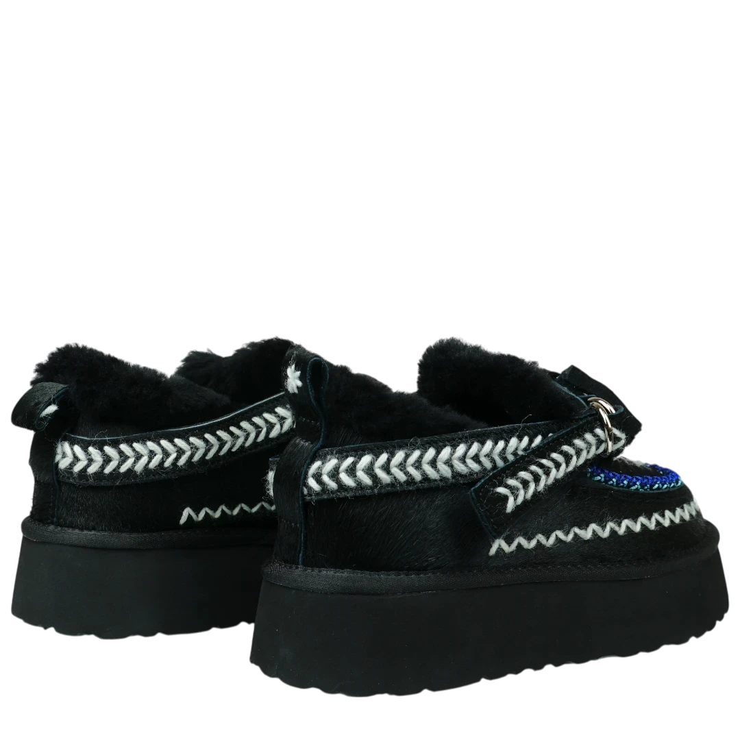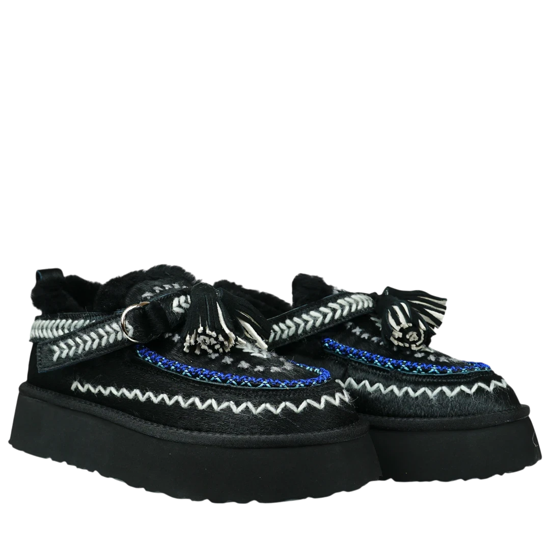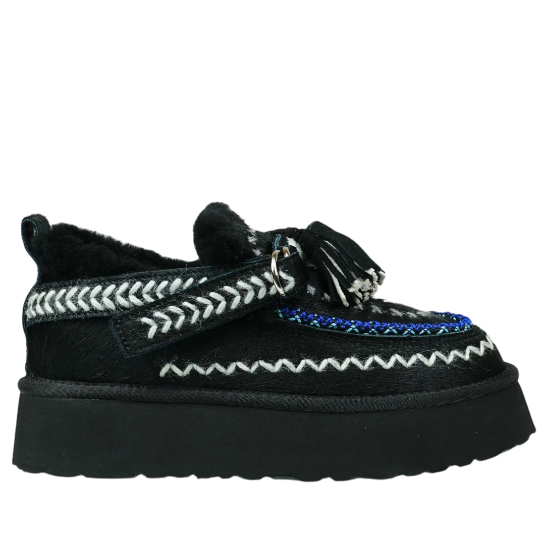 Ove Nanku gležnjače u klasičnoj crnoj boji donose savršen balans između udobnosti, topline i modernog izgleda. Izrađene od mekanog krzna s luksuznim teksturnim efektom, ukrašene su izraženim bijelim šavovima i diskretnim detaljima u plavim tonovima koji unose dozu prefinjenosti. Unutrašnjost od mekanog krzna pruža izuzetnu toplinu i osjećaj ugode tokom hladnih dana, dok visoki gumeni đon obezbjeđuje stabilnost i udobnost pri svakom koraku. Dekorativne resice i bočni remen s detaljima od tkanine dodatno naglašavaju ručno rađeni karakter modela. Idealne su za sve koji traže spoj funkcionalnosti, topline i prepoznatljivog zimskog stila.