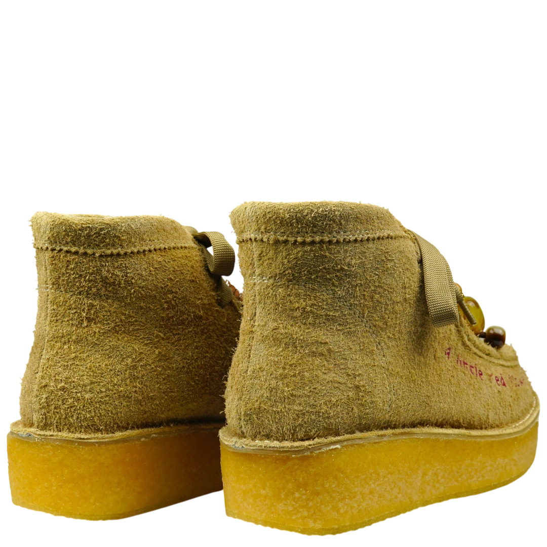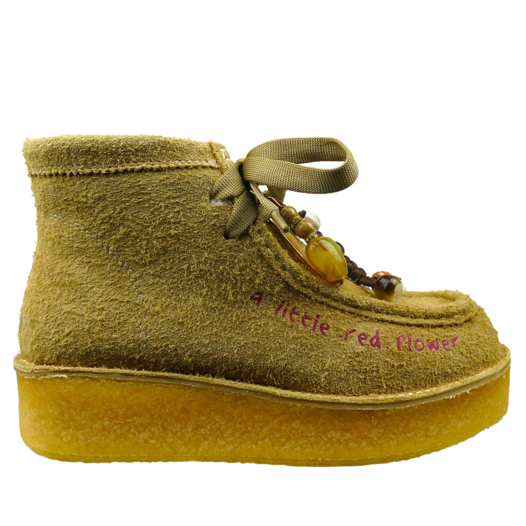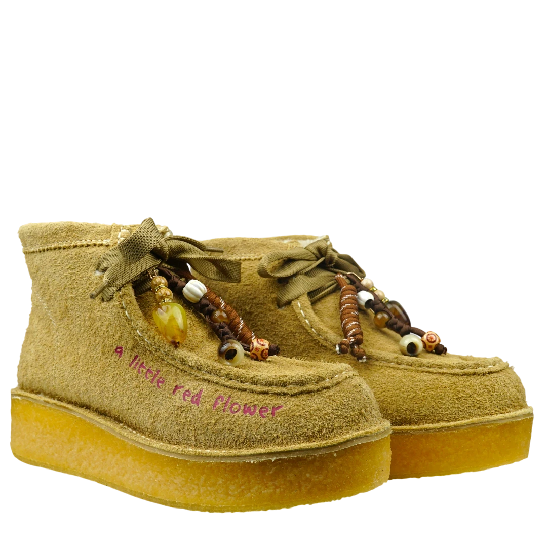 Ove Nanku gležnjače u boji pijeska donose opušten boho duh i unikatnu estetiku brenda. Izrađene od brušene kože rustikalne teksture, ukrašene su detaljima od perlica i drvenih elemenata na vezicama, što im daje autentičan i razigran karakter. Na bočnoj strani nalazi se ružičasti natpis “a little red flower”, koji unosi dašak umjetničkog izraza. Deblji gumeni đon pruža udobnost i stabilnost, dok topli tonovi i ručno rađeni detalji čine ovaj model savršenim izborom za one koji cijene slobodan, nekonvencionalan i moderan stil.