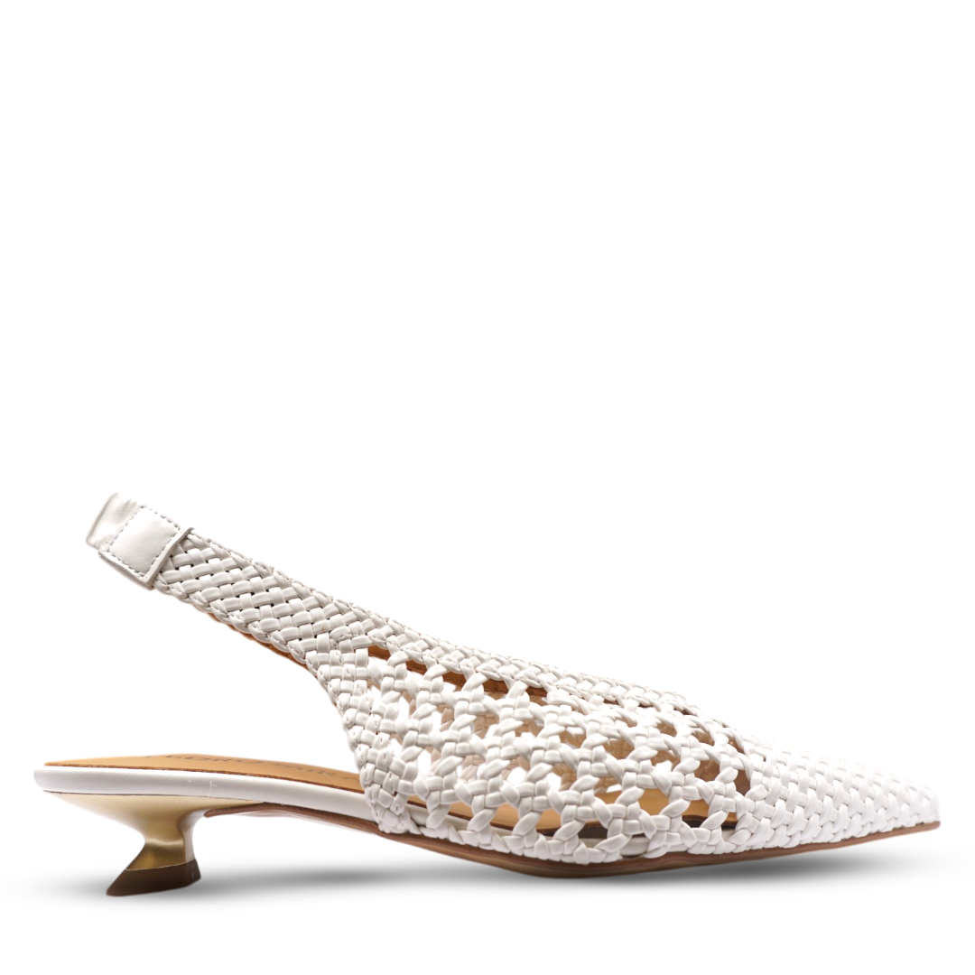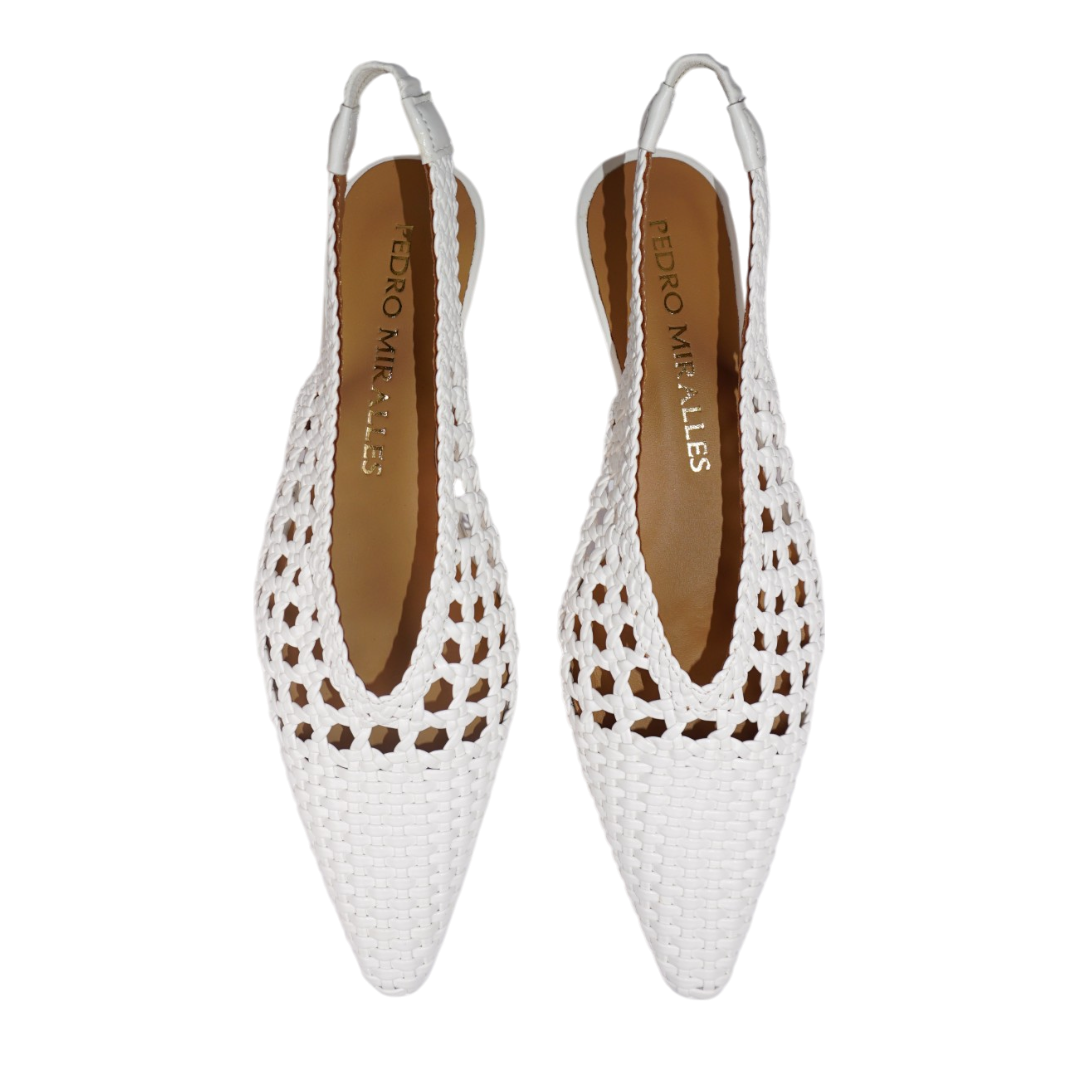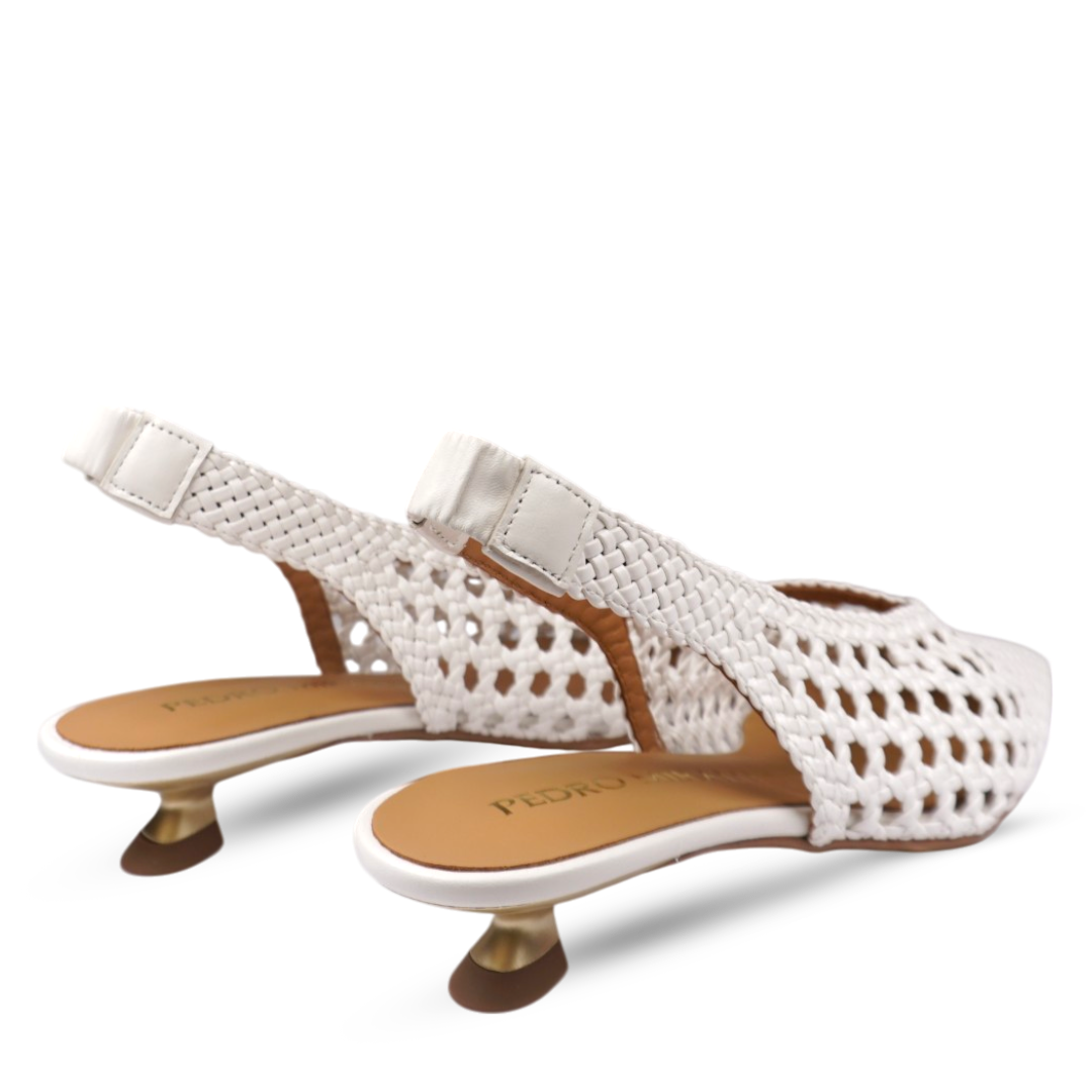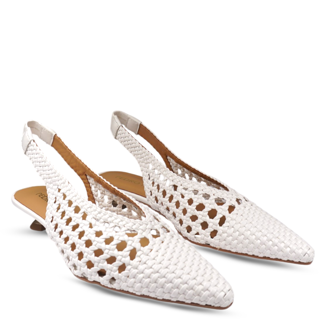 Ove ženske sandale u bijeloj boji spoj su elegancije i sofisticiranog dizajna. Izrađene od pletene kože, odišu luksuznim izgledom, dok pažljivo izrađeni detalji pružaju notu profinjenosti i unikatnosti. Njihov bezvremenski dizajn savršen je za svečane prilike, ljetne večeri ili elegantne dnevne kombinacije. Lagane i udobne, lako se kombinuju s haljinama, suknjama ili klasičnim pantalonama, čineći svaki outfit izuzetno stilizovanim i ženstvenim.