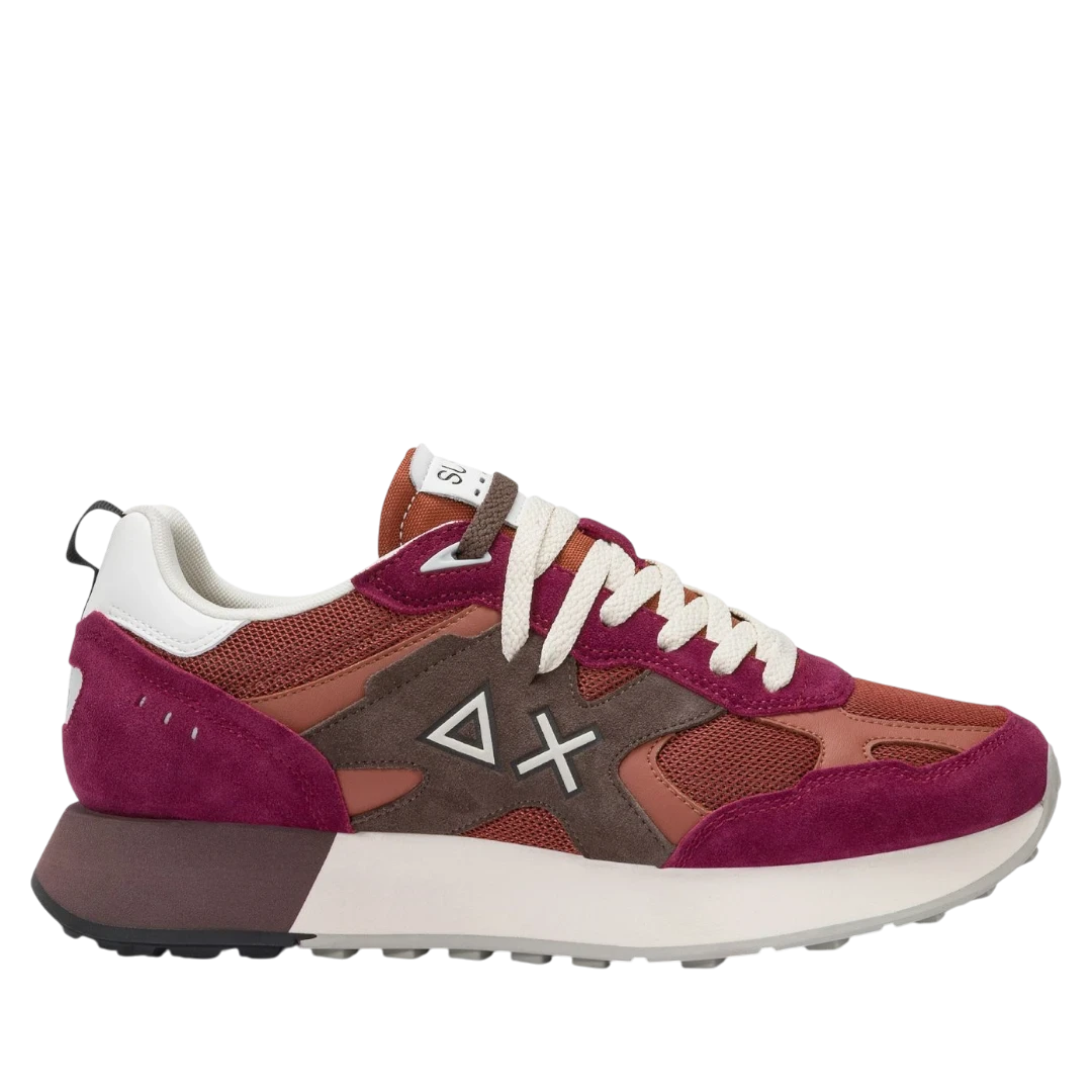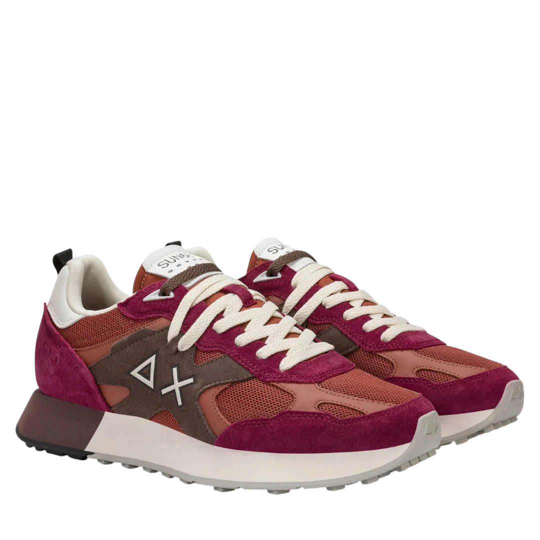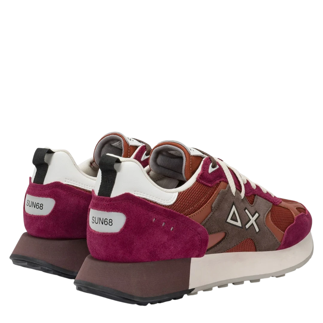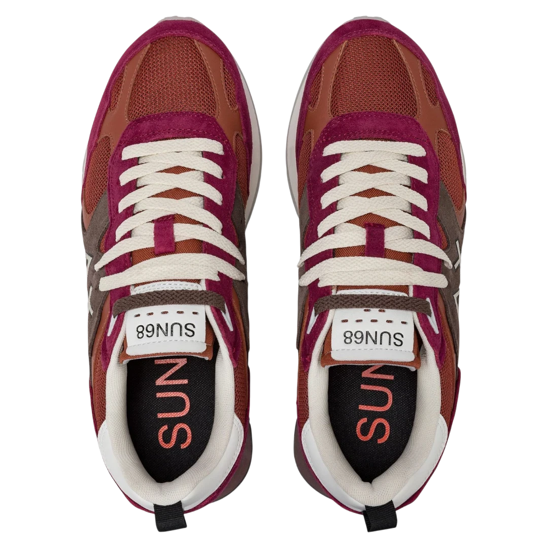Ove SUN68 patike donose hrabar spoj boja i materijala, savršen za one koji vole izražajan stil. Kombinacija bordo, smeđih i ružičastih tonova stvara moderan, dinamičan izgled, dok brušena koža i mrežasti detalji osiguravaju udobnost i prozračnost. Prepoznatljivi brend simboli istaknuti su na bočnim stranama, naglašavajući autentičnost i sportski duh SUN68 dizajna. Deblji bijeli đon pruža stabilnost i lakoću pri hodu, čineći ovaj model idealnim za svakodnevne aktivnosti i urbane kombinacije. Patike koje spajaju udobnost, kvalitet i moderan izraz u jednom upečatljivom paru.