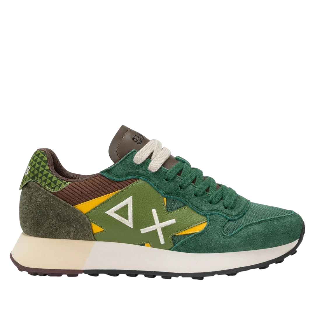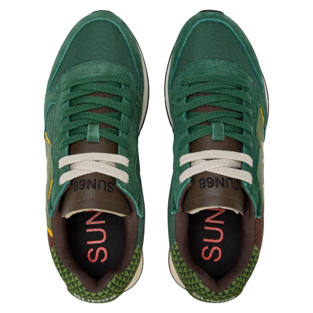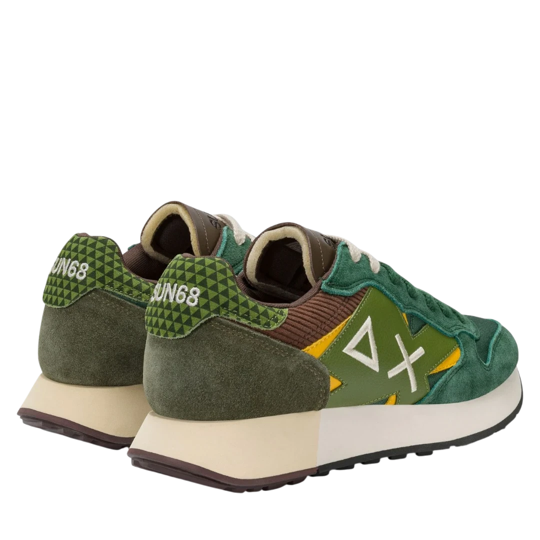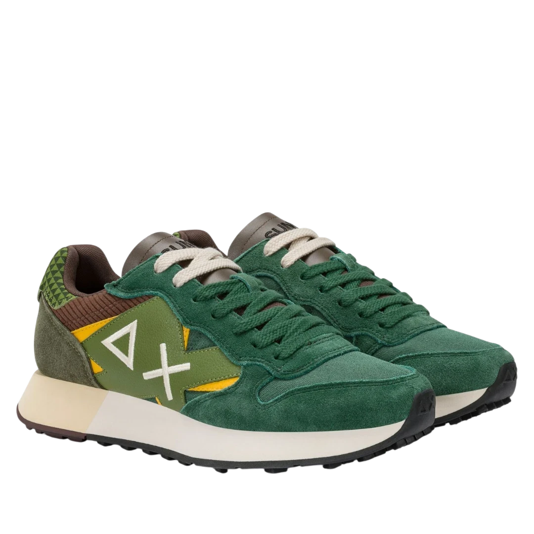 Ove SUN68 patike donose savršen balans između retro dizajna i savremene udobnosti. Izrađene od kombinacije brušene kože i tekstila, ističu se nijansama zelene i žute koje unose energiju i dinamiku u svaku kombinaciju. Karakteristični geometrijski simboli SUN68 na bočnim stranama i detalji u kontrastnim tonovima daju im prepoznatljiv urbani identitet.