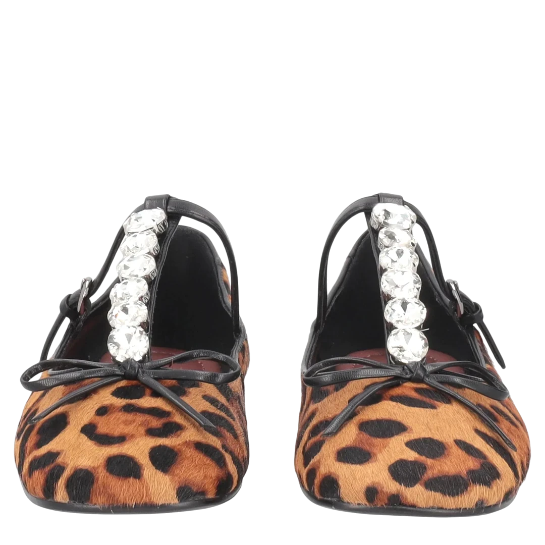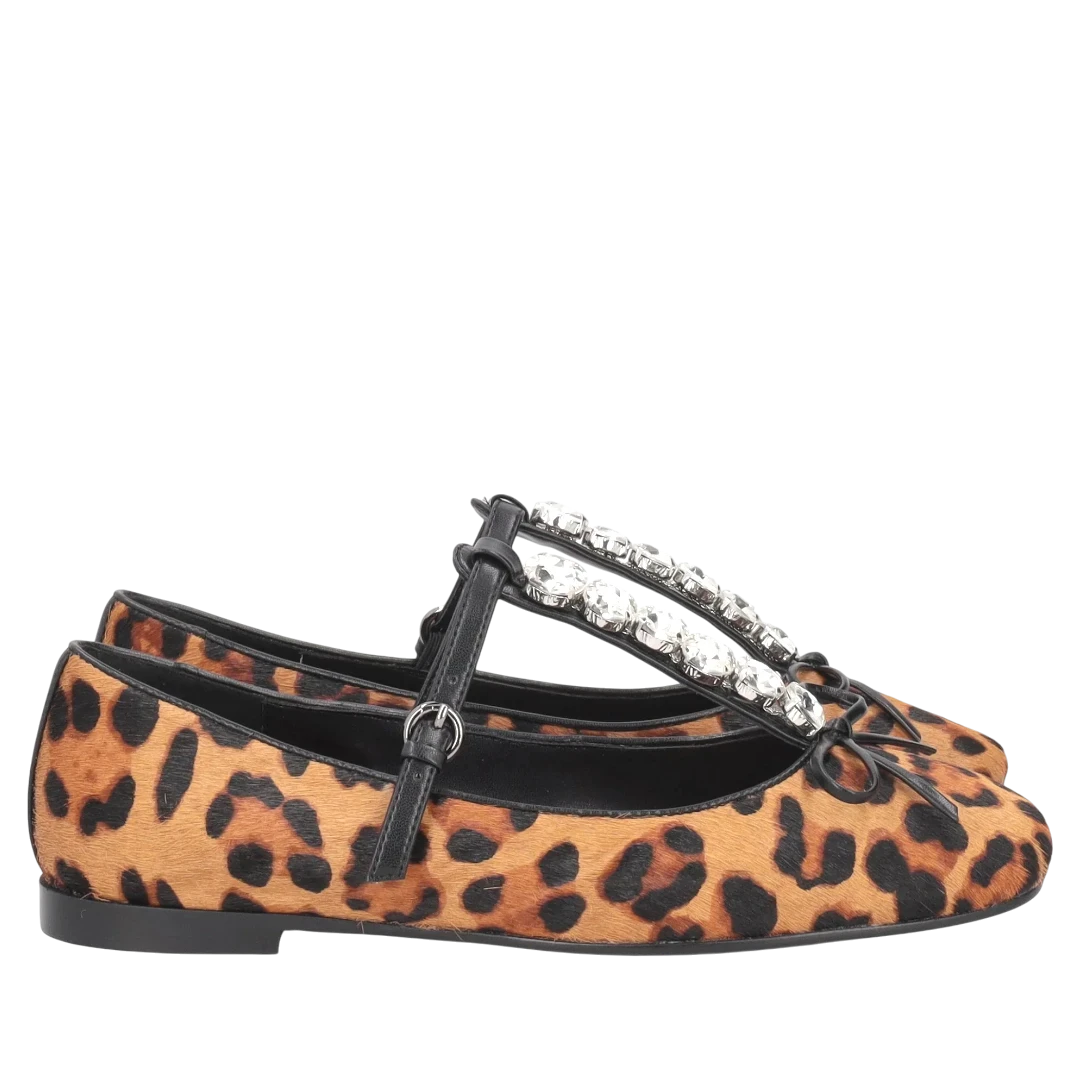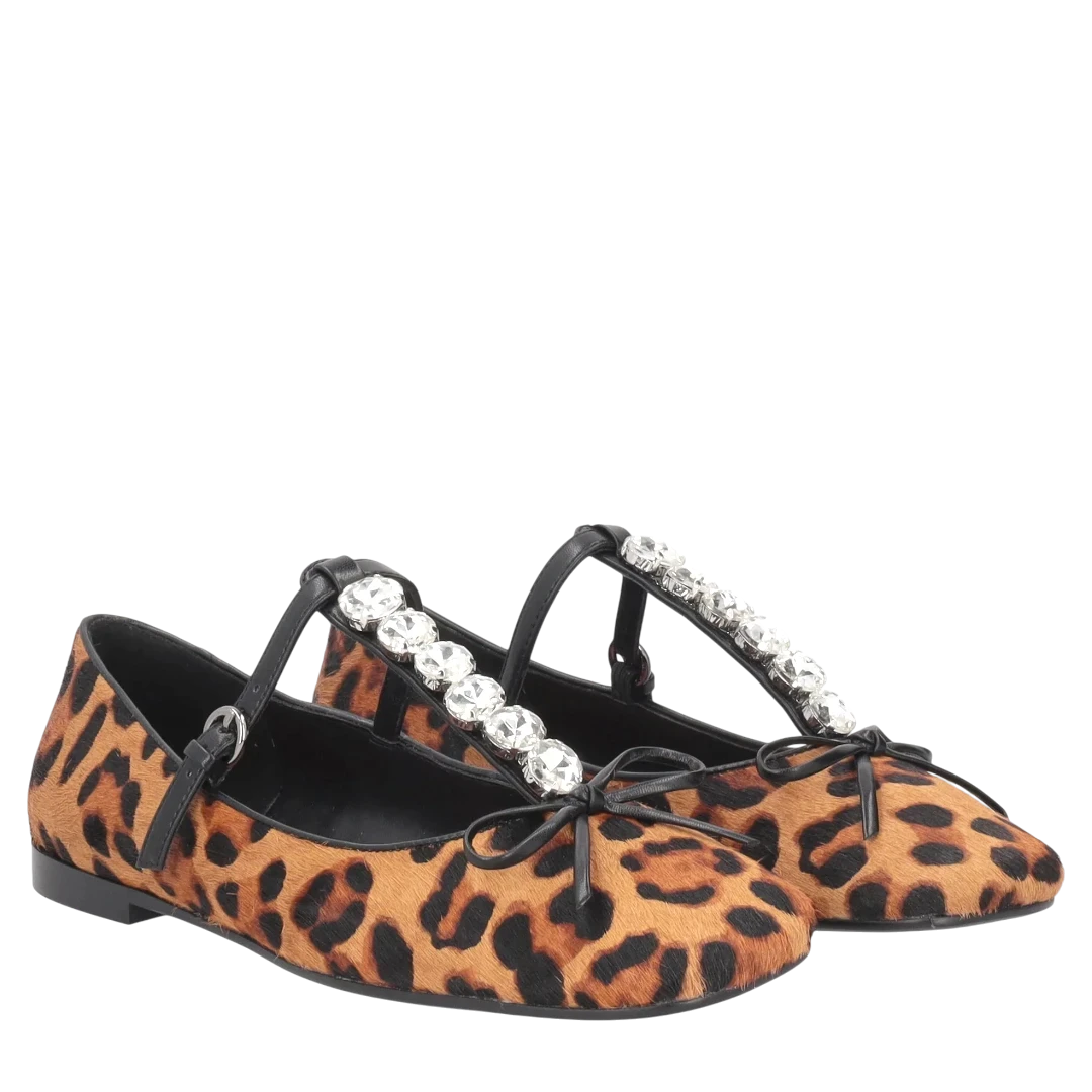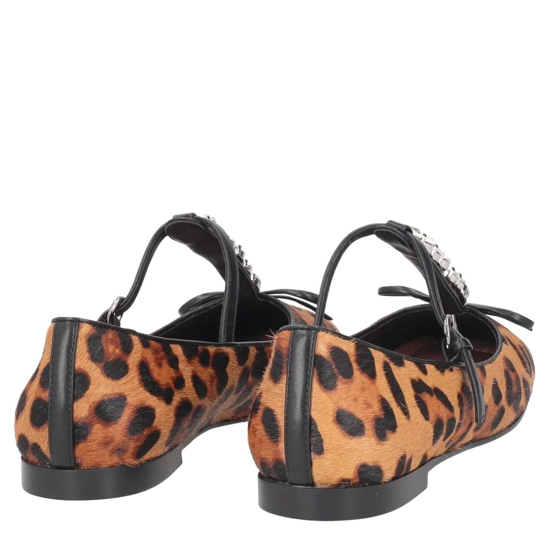 Ove Tosca Blu baletanke s leopard printom donose savršenu kombinaciju ženstvenosti, glamura i odvažnog stila. Izrađene od materijala s efektom dlake, ističu se upečatljivim animal printom koji unosi dozu razigranosti. Prednji dio krase tanke crne trakice i remenčići ukrašeni velikim kristalima, koji ovim baletankama daju luksuzan i sofisticiran izgled.