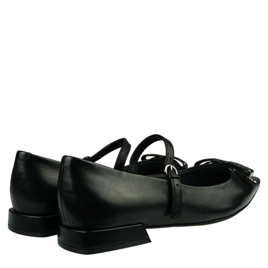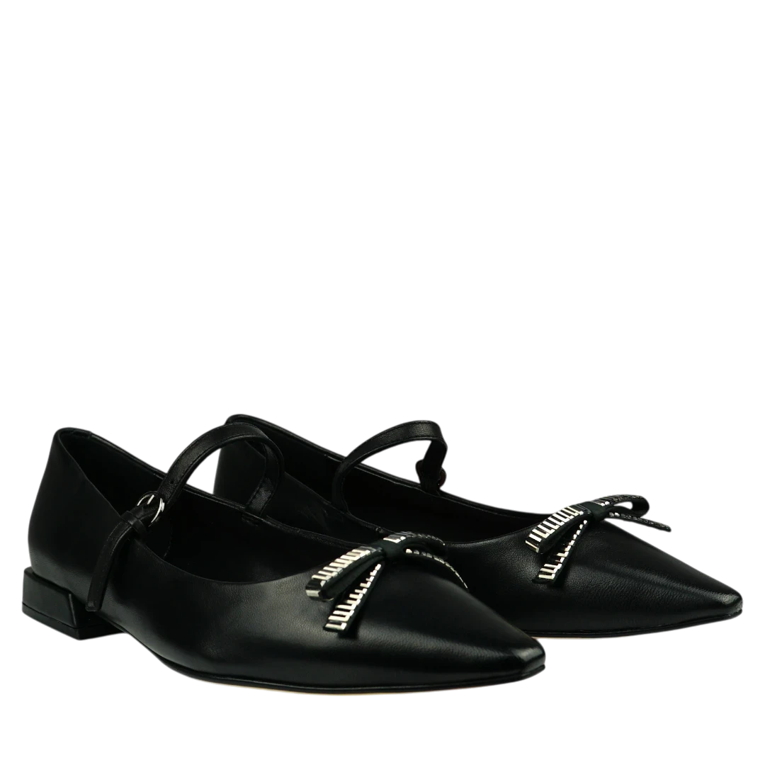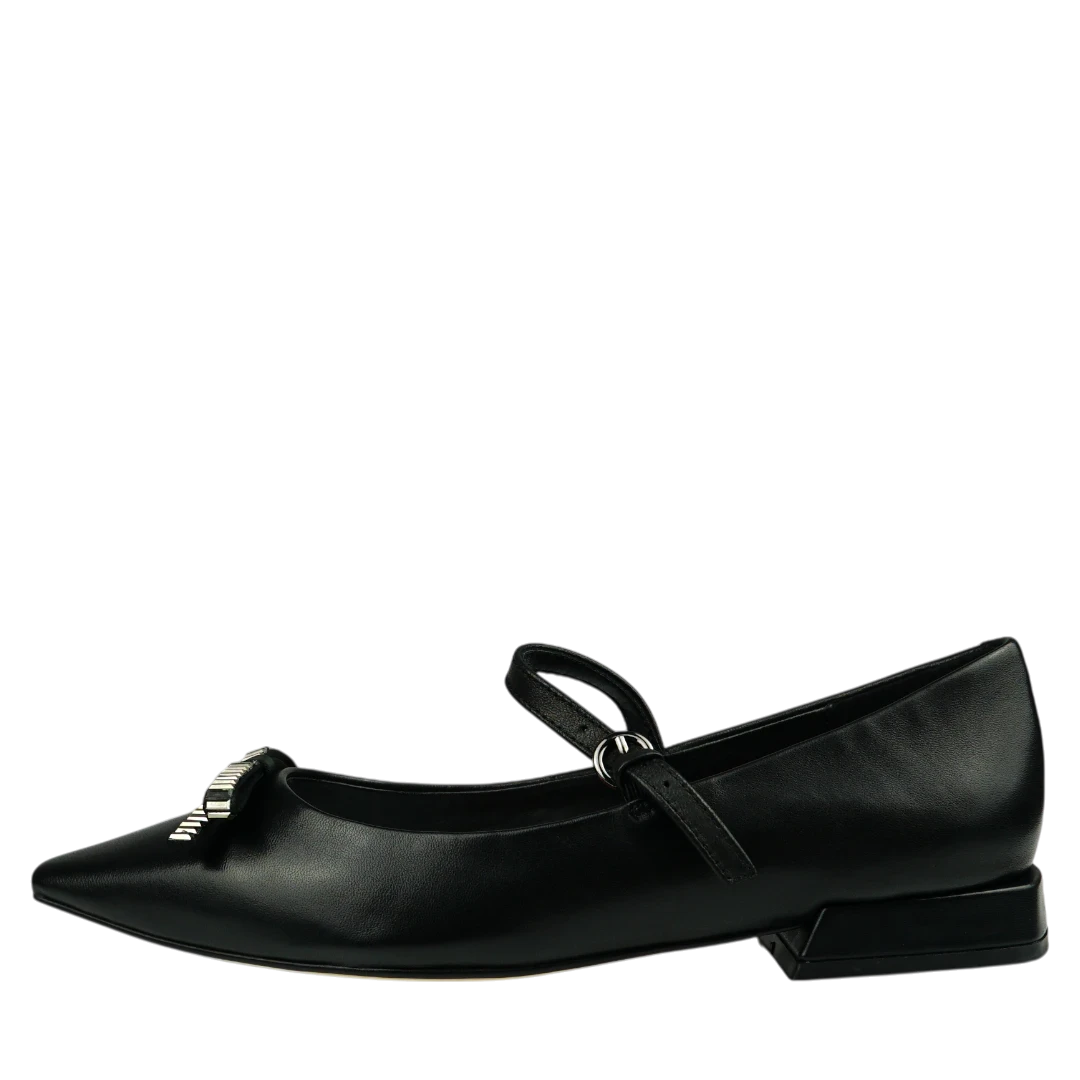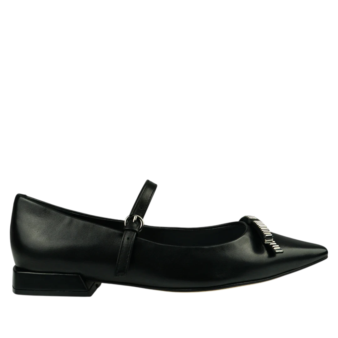Elegantne i profinjene, ove Tosca Blu baletanke u crnoj koži donose savremeni spoj klasike i sofisticiranosti. Ističu se dekorativnim detaljem s kristalima na špicastom vrhu koji dodaje luksuzan sjaj, dok tanka trakica preko rista naglašava ženstvenost i pruža stabilnost. Nizak blok peta osigurava udobnost tokom cijelog dana, čineći ih savršenim izborom za elegantne svakodnevne kombinacije ili večernje prilike koje traže suptilan, ali upečatljiv stil.