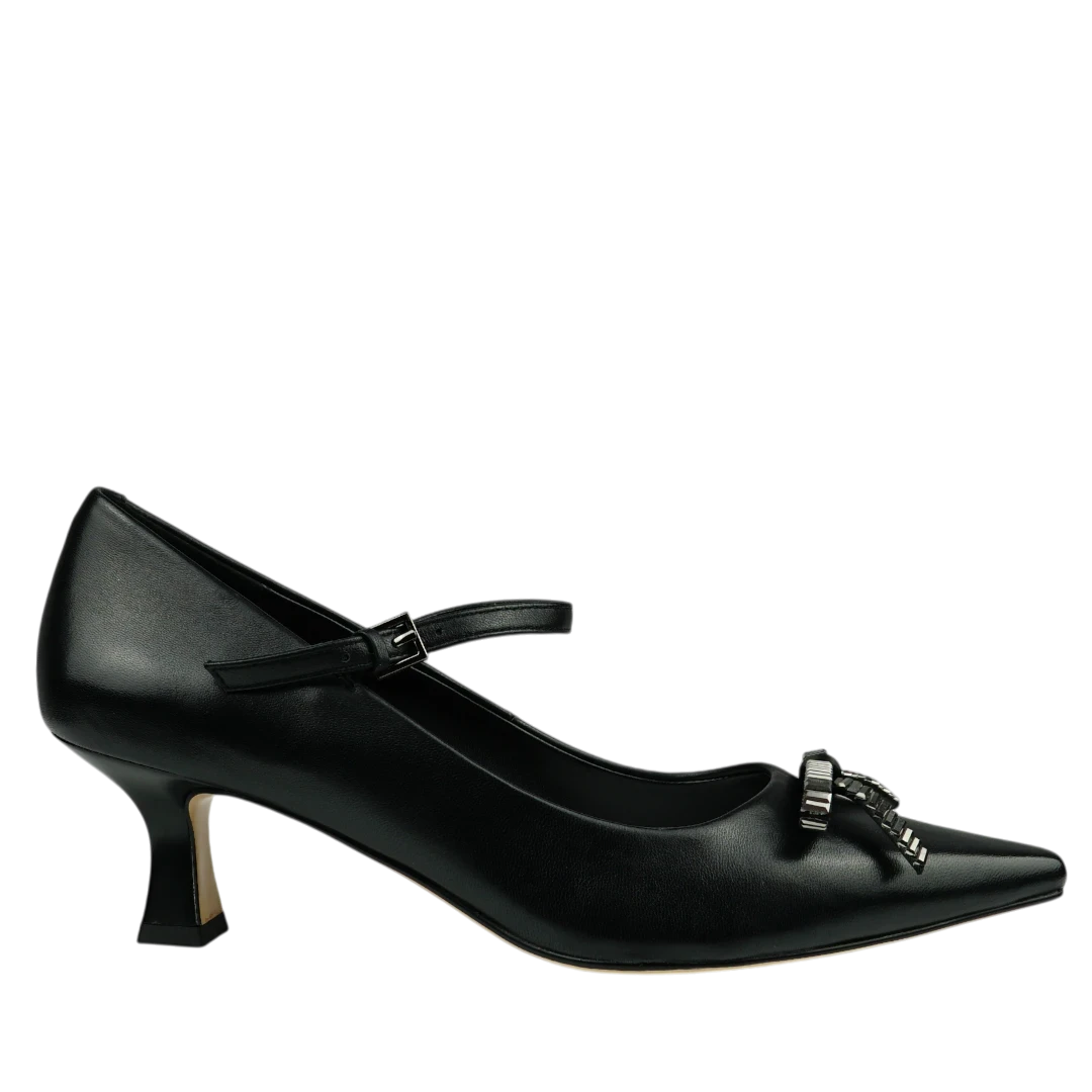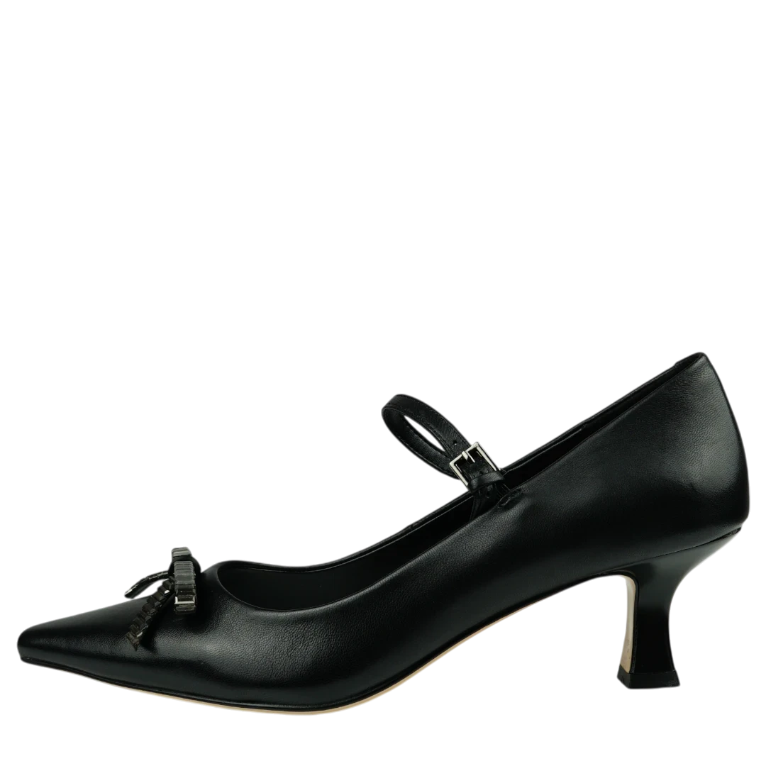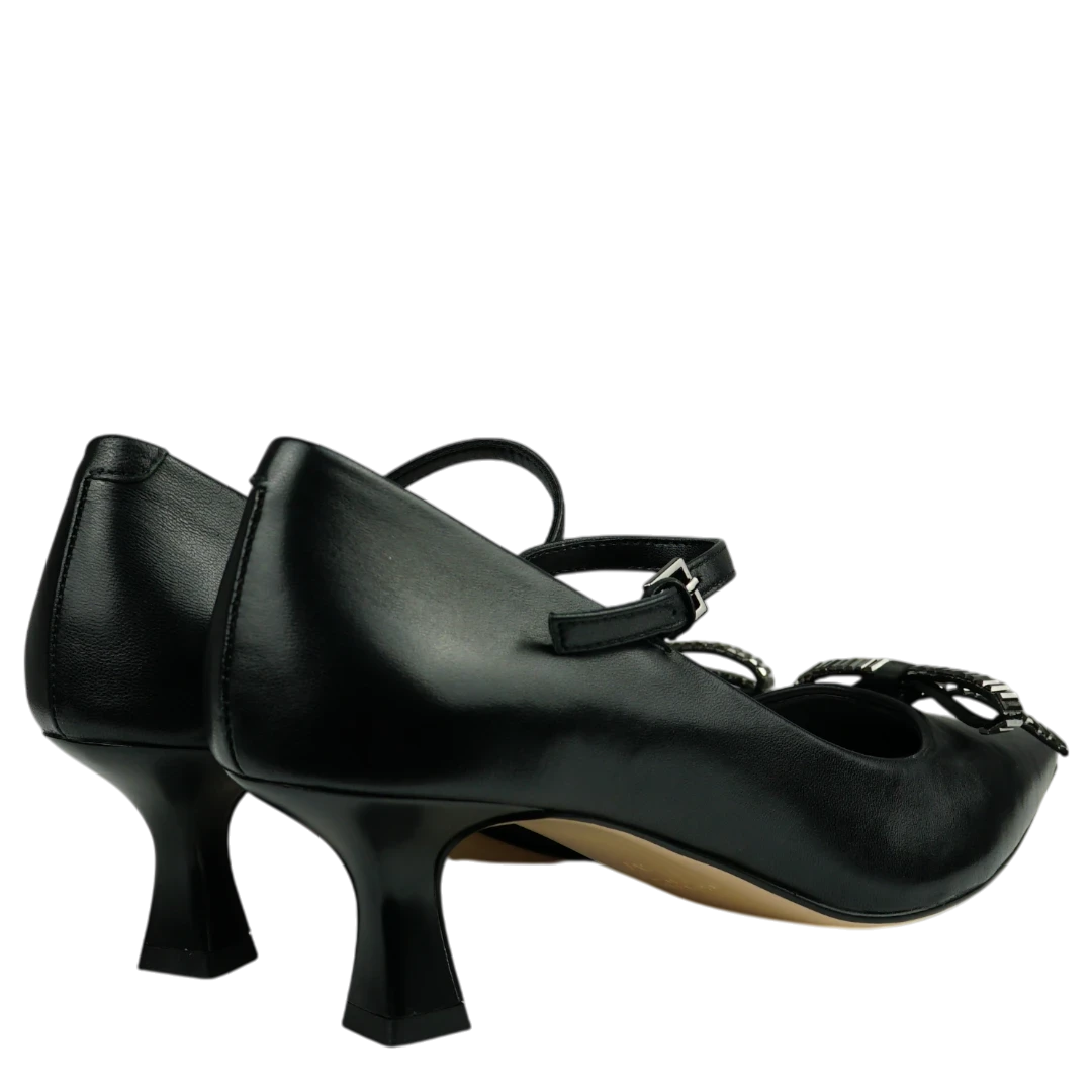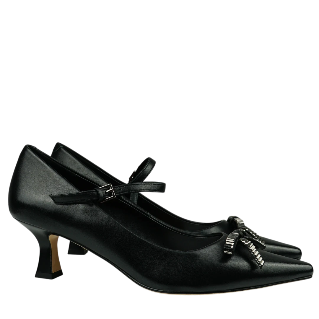 Ove Tosca Blu salonke u crnoj boji odišu klasičnim šarmom i sofisticiranim retro stilom. Izrađene od fine kože, odlikuju se elegantnim remenčićem preko rista koji pruža stabilnost i nježan vintage izgled. Na špicastom vrhu nalazi se ukrasna mašna s kristalnim detaljima, koja dodaje profinjenu notu luksuza. Niža potpetica pruža savršenu ravnotežu između udobnosti i elegancije. Savršen izbor za žene koje vole diskretnu eleganciju i bezvremenski stil – idealne za dnevne i večernje prilike, poslovne kombinacije ili posebne događaje.