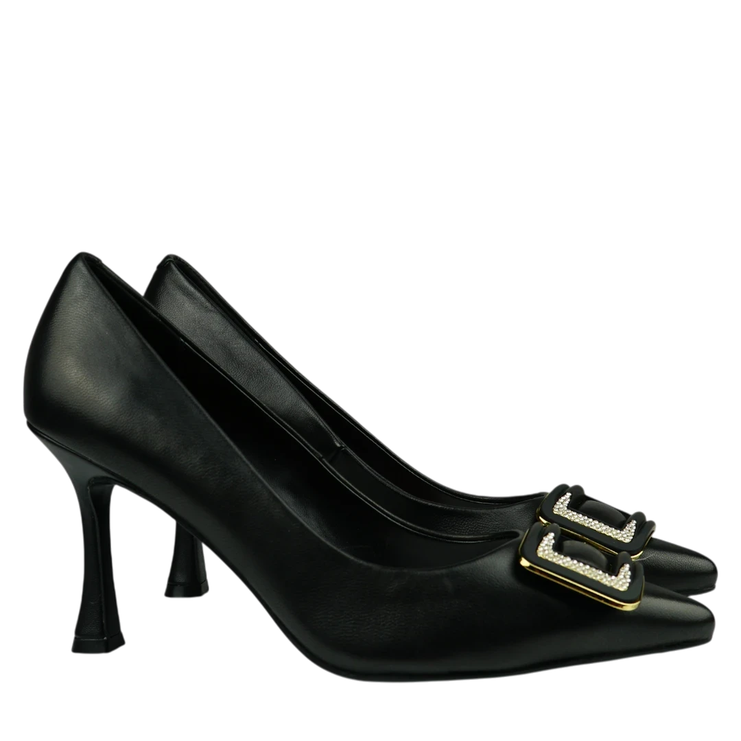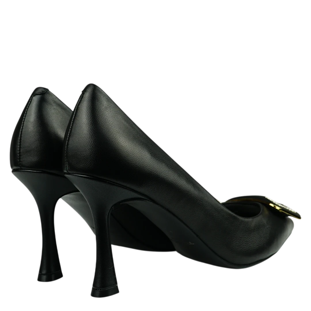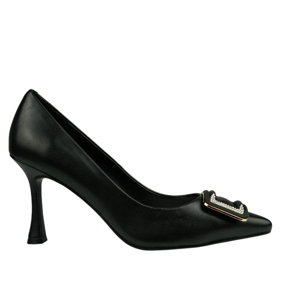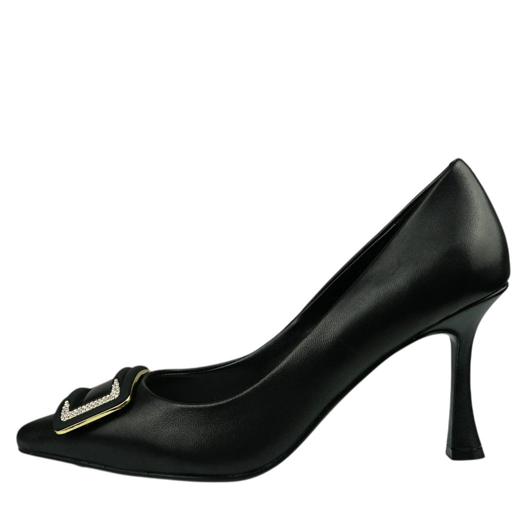 Ove Tosca Blu salonke u crnoj boji predstavljaju suštinu sofisticirane elegancije. Izrađene od glatke, visokokvalitetne kože, krase ih dekorativna kopča s metalnim i kristalnim detaljima koji dodaju dašak luksuza i profinjenosti. Špicasti vrh i tanka potpetica izdužuju siluetu noge, dok pažljivo oblikovan kalup pruža udobnost i stabilnost pri hodu.