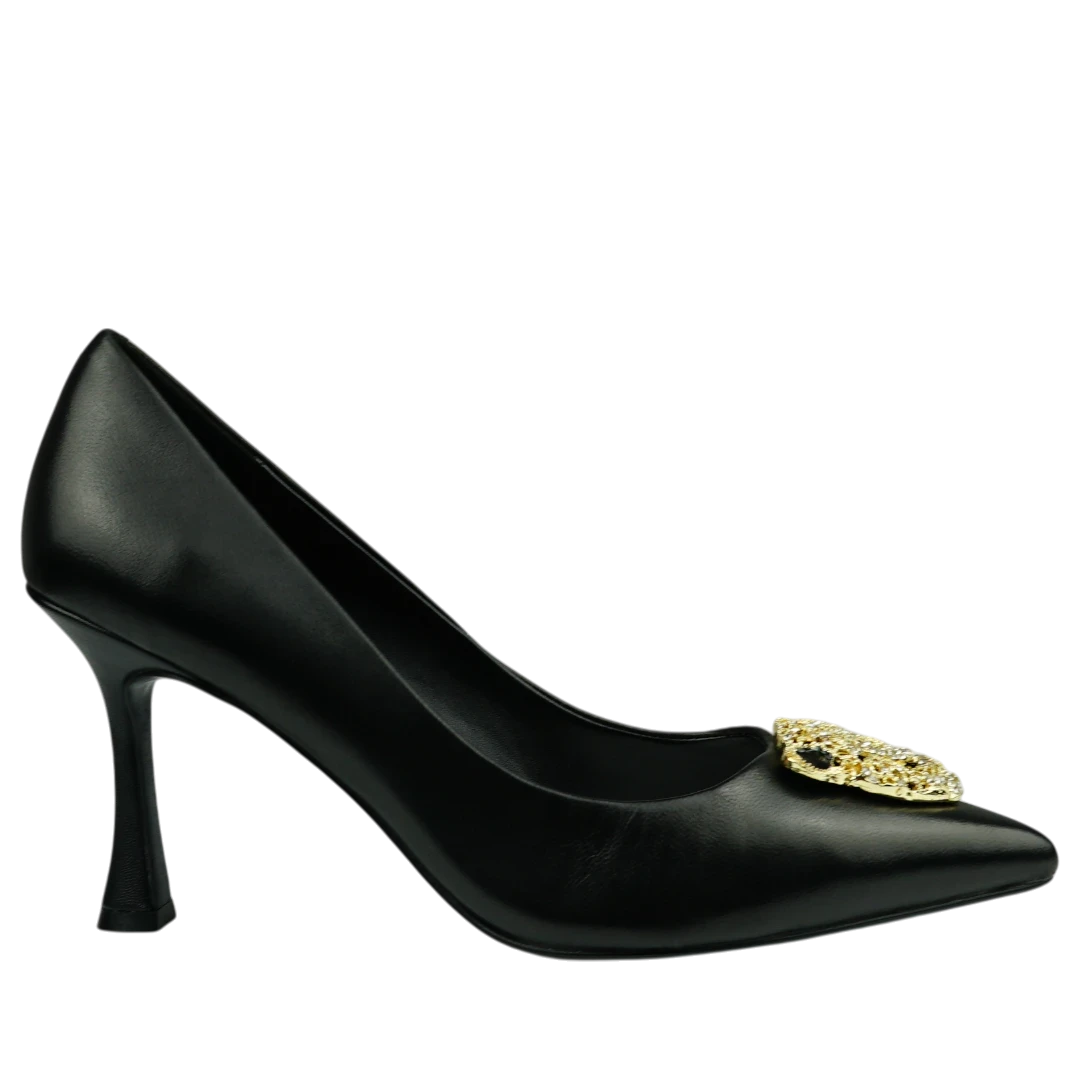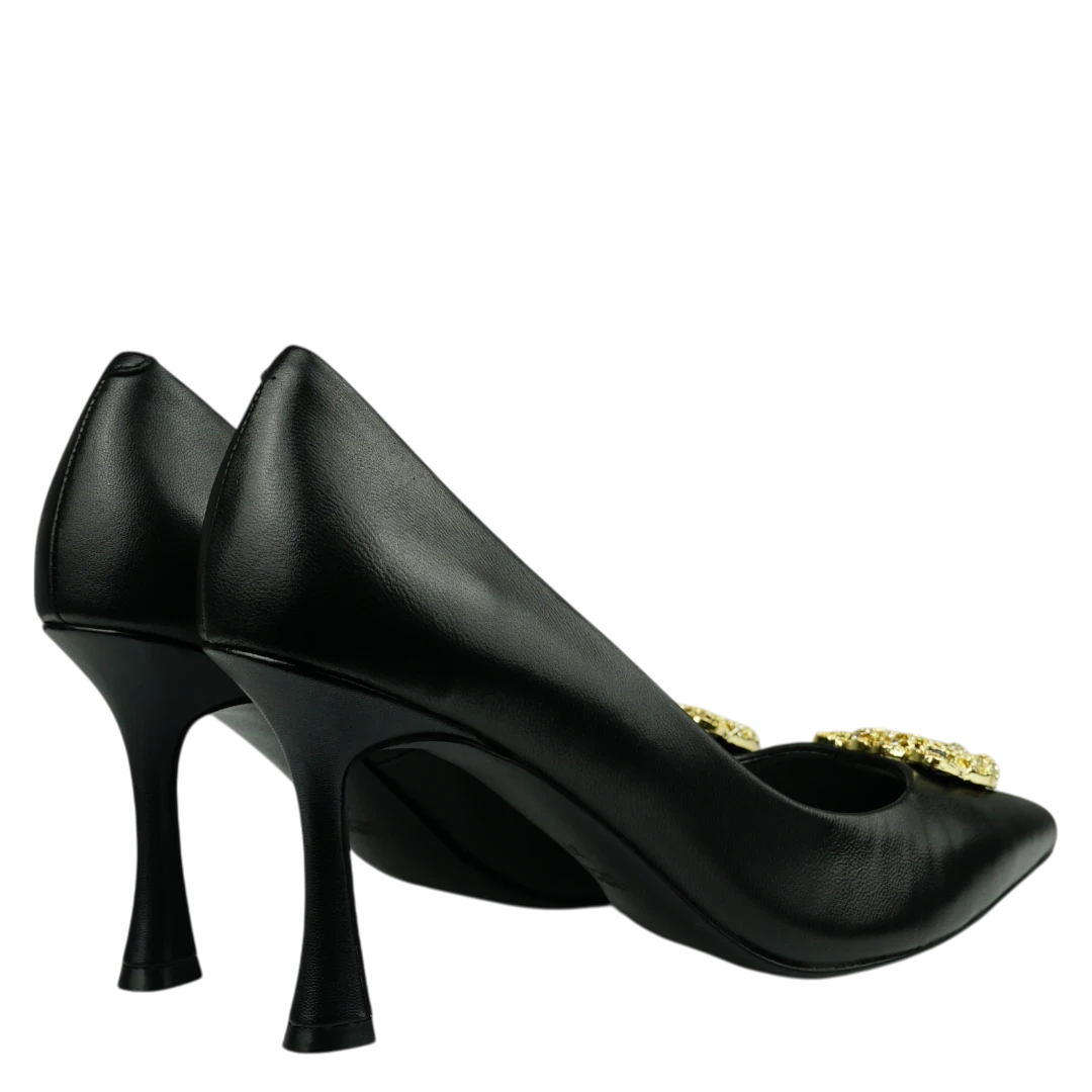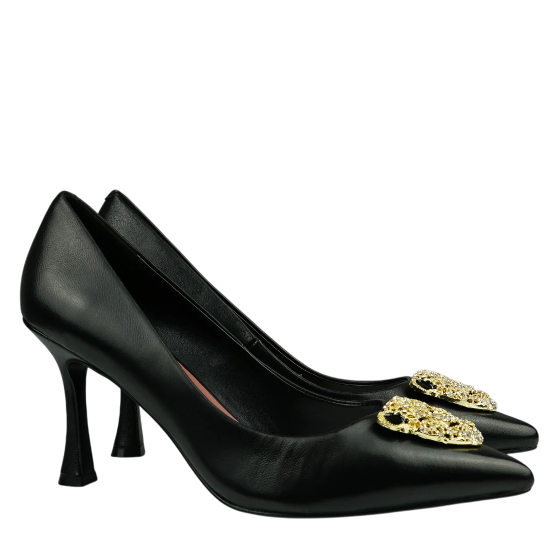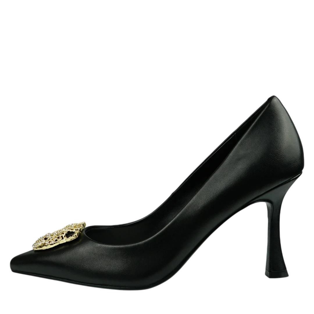 Ove Tosca Blu salonke u klasičnoj crnoj boji predstavljaju spoj bezvremenske elegancije i modernog luksuza. Izrađene od fine glatke kože, ističu se profinjenim špicastim vrhom ukrašenim zlatnim metalnim detaljem koji dodaje dozu glamura. Tanka potpetica pruža ženstvenu siluetu i izdužuje liniju noge, dok pažljivo oblikovan kroj osigurava udobnost i savršeno pristajanje. Idealan su izbor za svečane prilike, poslovne kombinacije ili večernje izlaske — cipele koje odišu samopouzdanjem i stilom svake moderne žene.