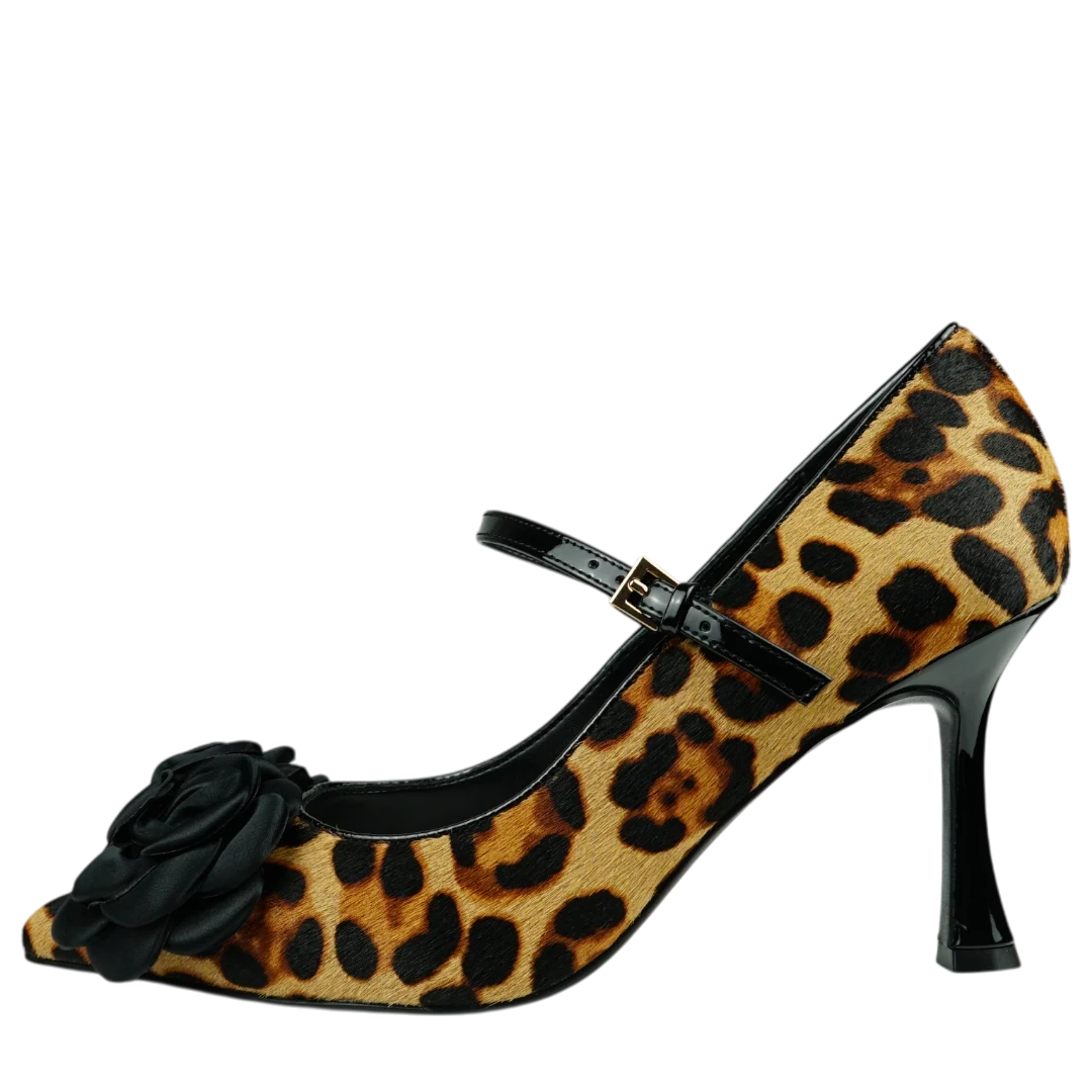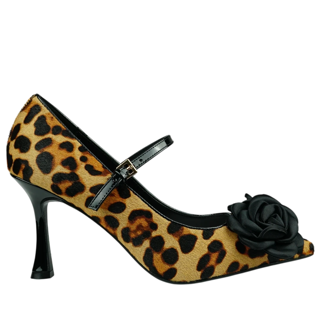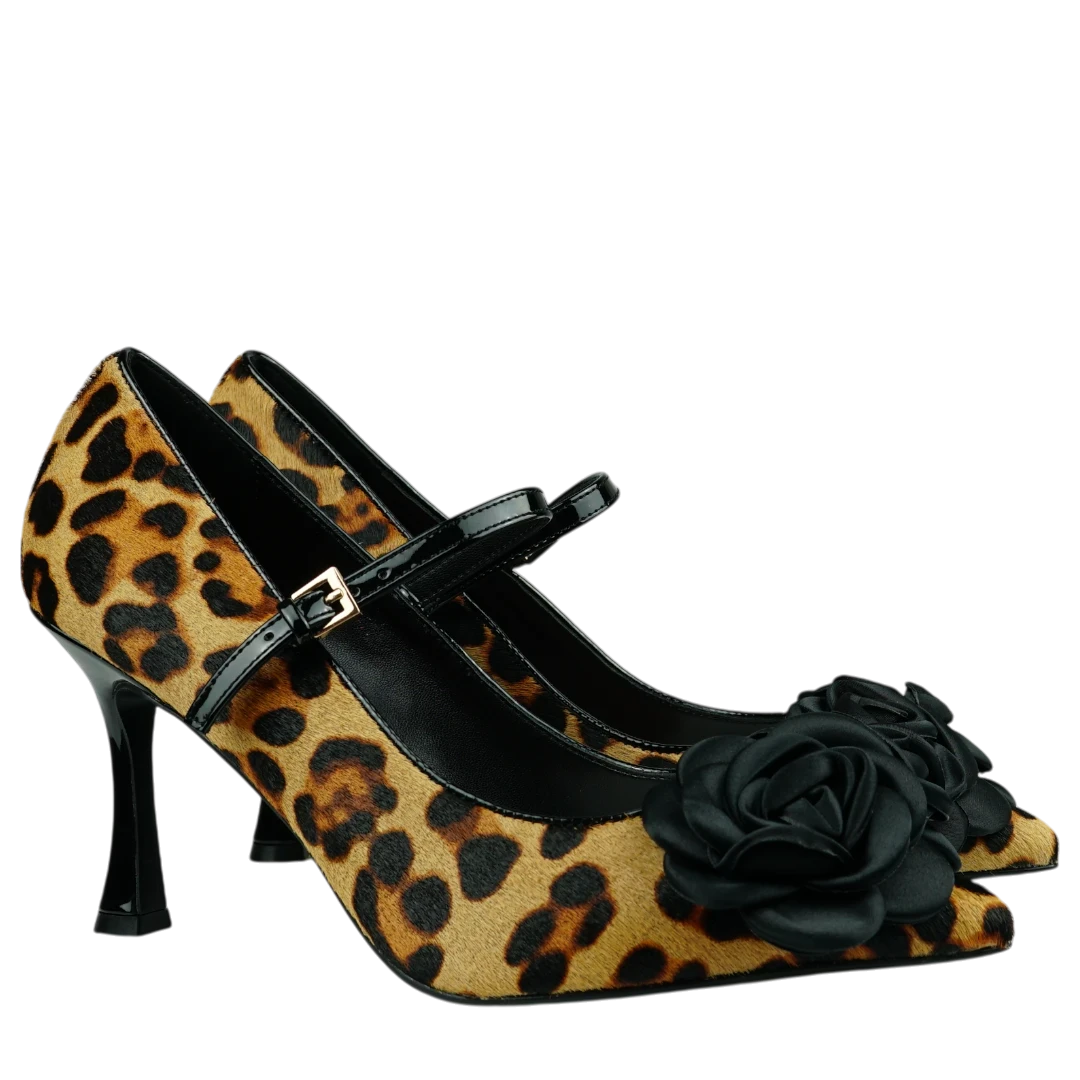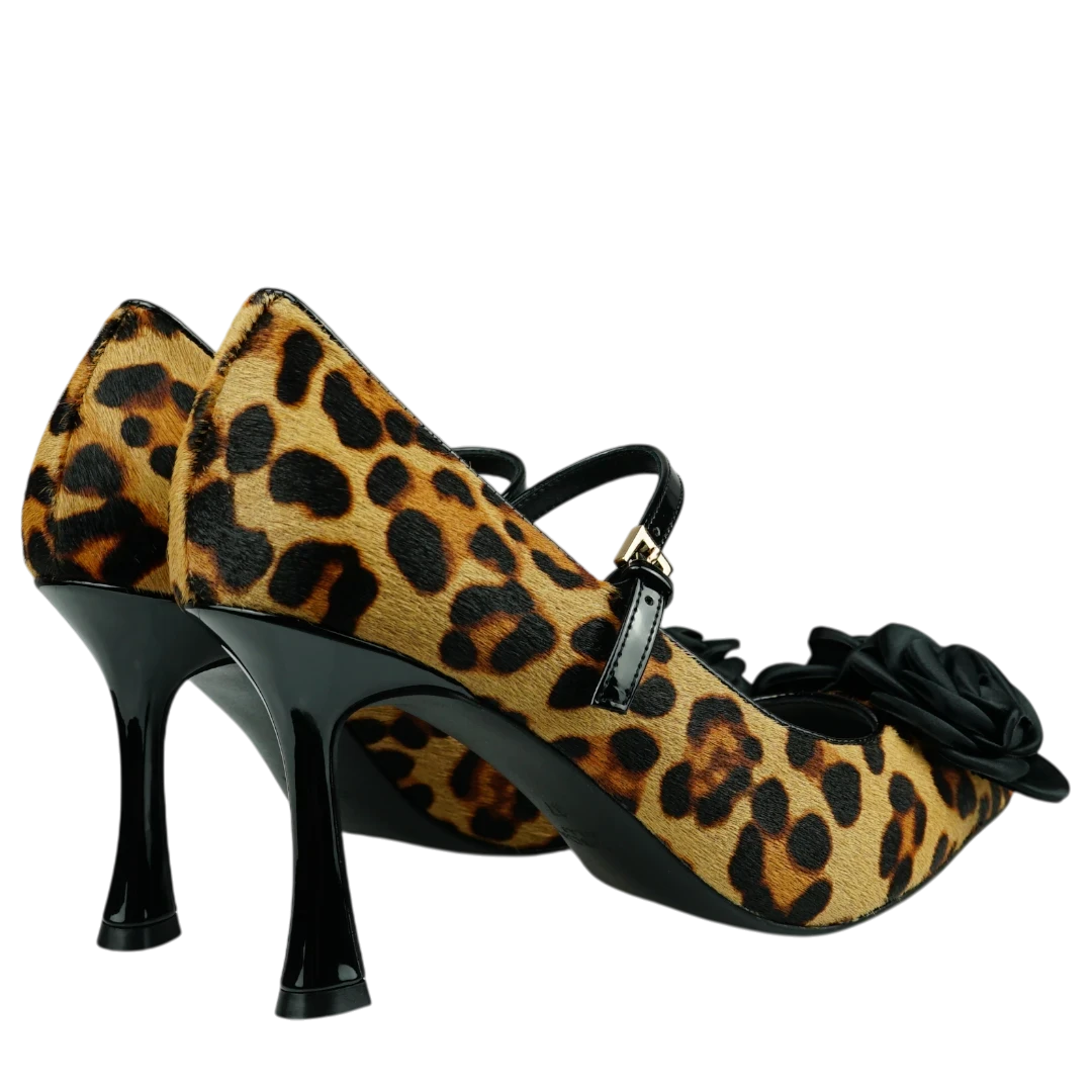 ve Tosca Blu salonke u leopard uzorku pravi su statement komad koji spaja klasičnu eleganciju i smjelu ženstvenost. Izrađene od teksturiranog materijala s animal printom, naglašene su crnom satenskom ružom na vrhu i tankim lakiranim remenčićem koji pruža dodatnu stabilnost i profinjen izgled. Tanka potpetica dodaje notu glamura, dok oblik s otvorenim prstima ističe eleganciju stopala. Savršene su za večernje prilike, koktel zabave ili kao upečatljiv detalj u jednostavnijem outfitu — idealne za žene koje vole odvažne modne izbore s daškom luksuza.