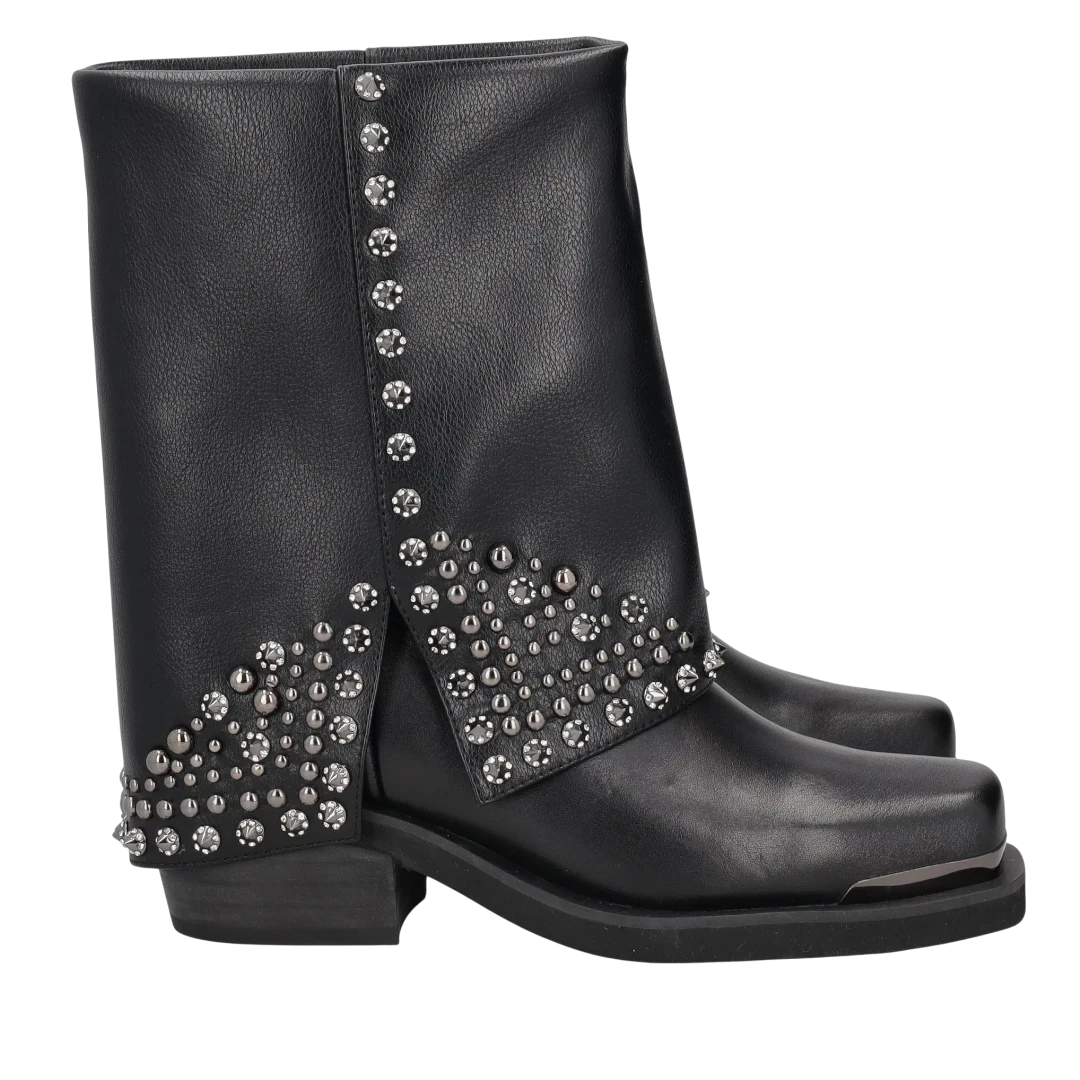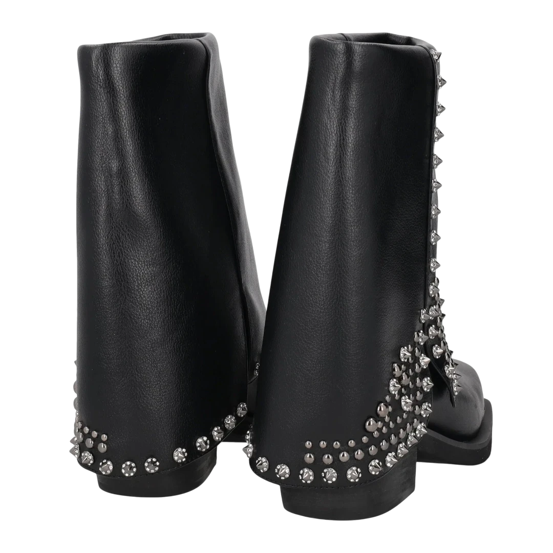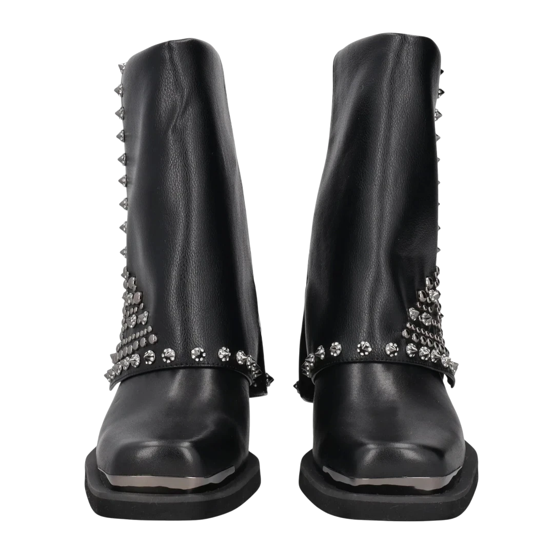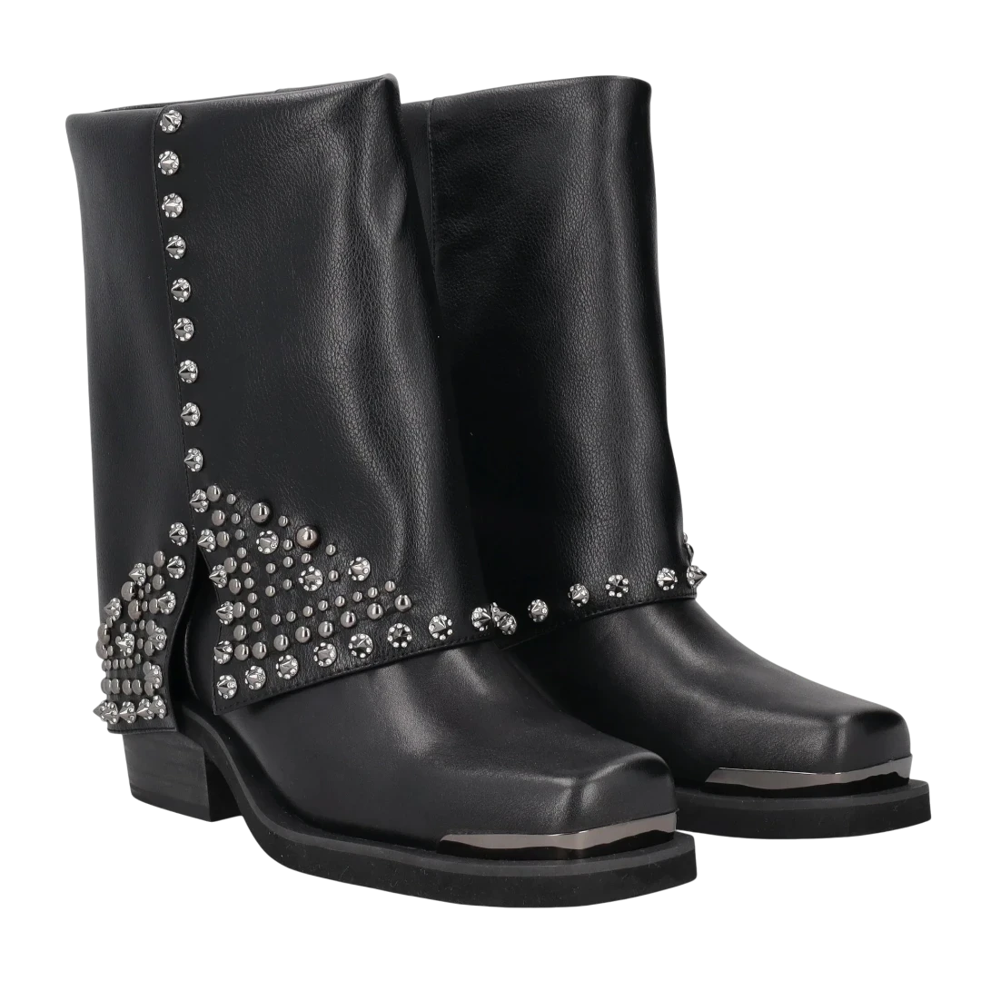 Ove Tosca Blu crne gležnjače odlikuju se odvažnim dizajnom i raskošnim detaljima. Izrađene od kvalitetne kože, ističu se širokom siluetom s ravnim cijevima i kvadratnim vrhom, dok bogati metalni nitni i kristali formiraju upečatljiv uzorak koji im daje glamurozan, rokerski karakter. Niska potpetica osigurava udobnost, a dekorativni elementi pretvaraju ih u pravi statement komad. Savršene su za žene koje žele dominirati stilom – najbolje se nose uz uske hlače, kratke suknje ili haljine, dodajući svakoj kombinaciji notu luksuza i samouvjerenosti.