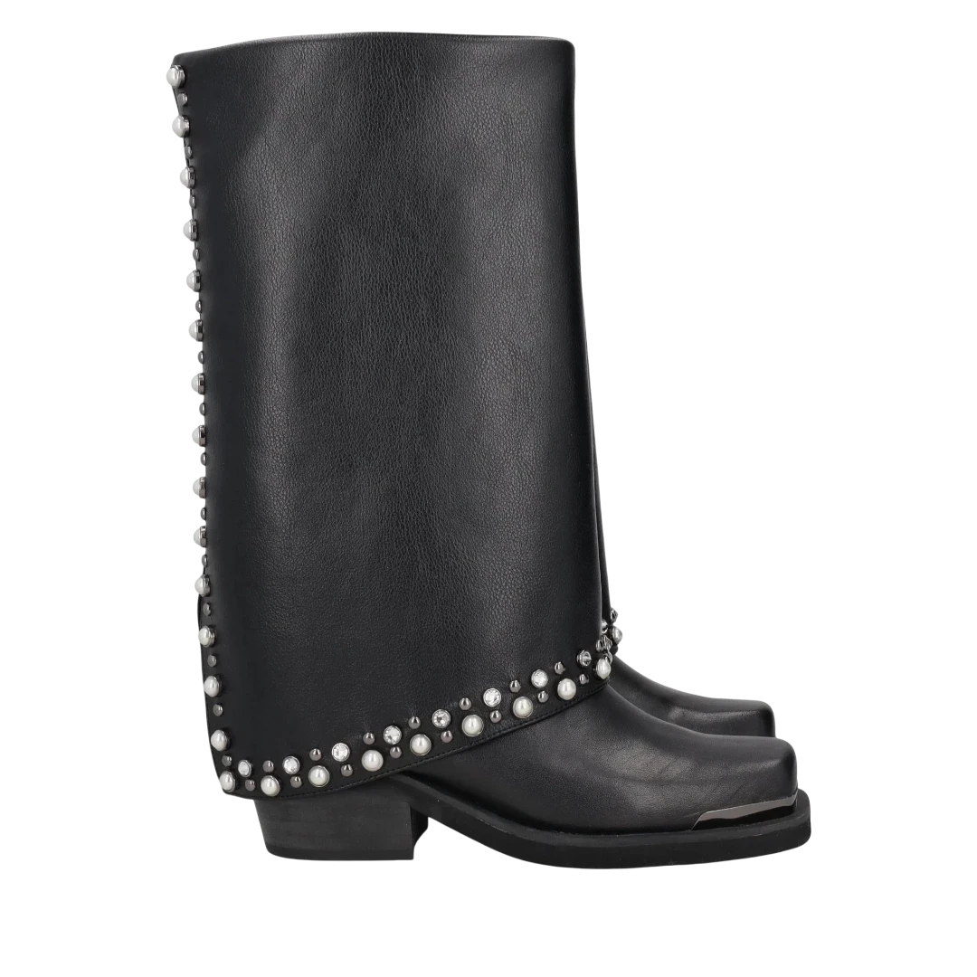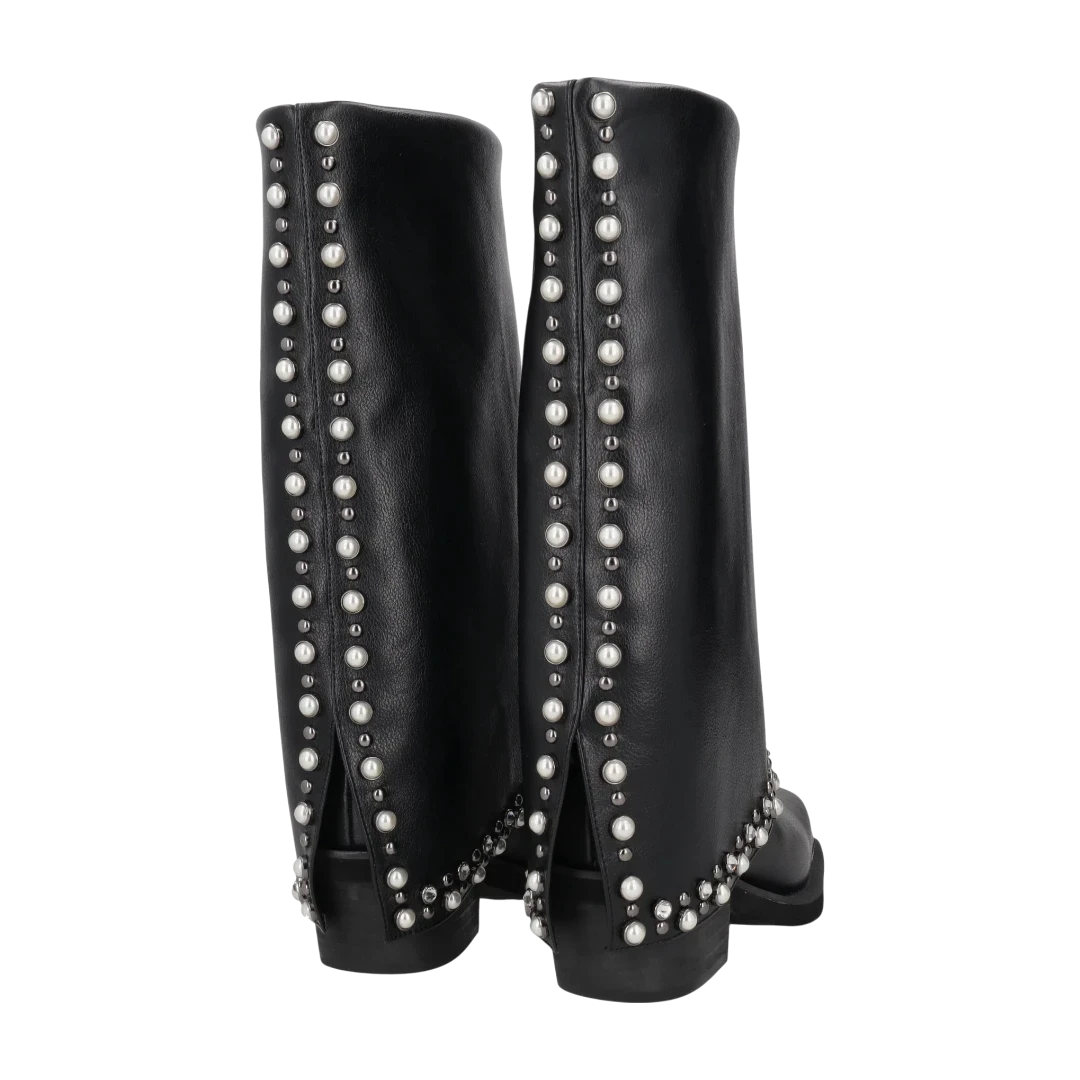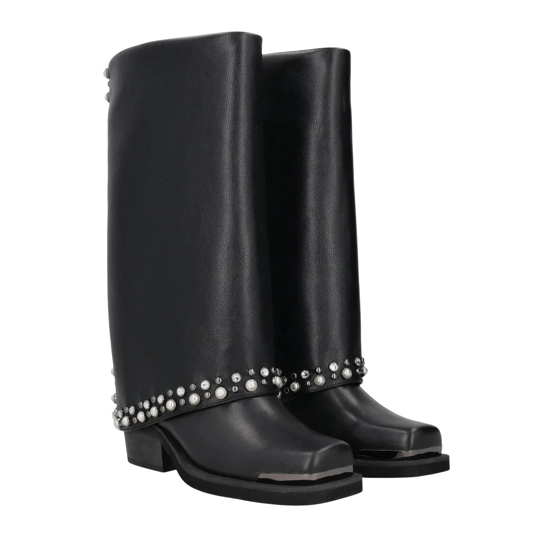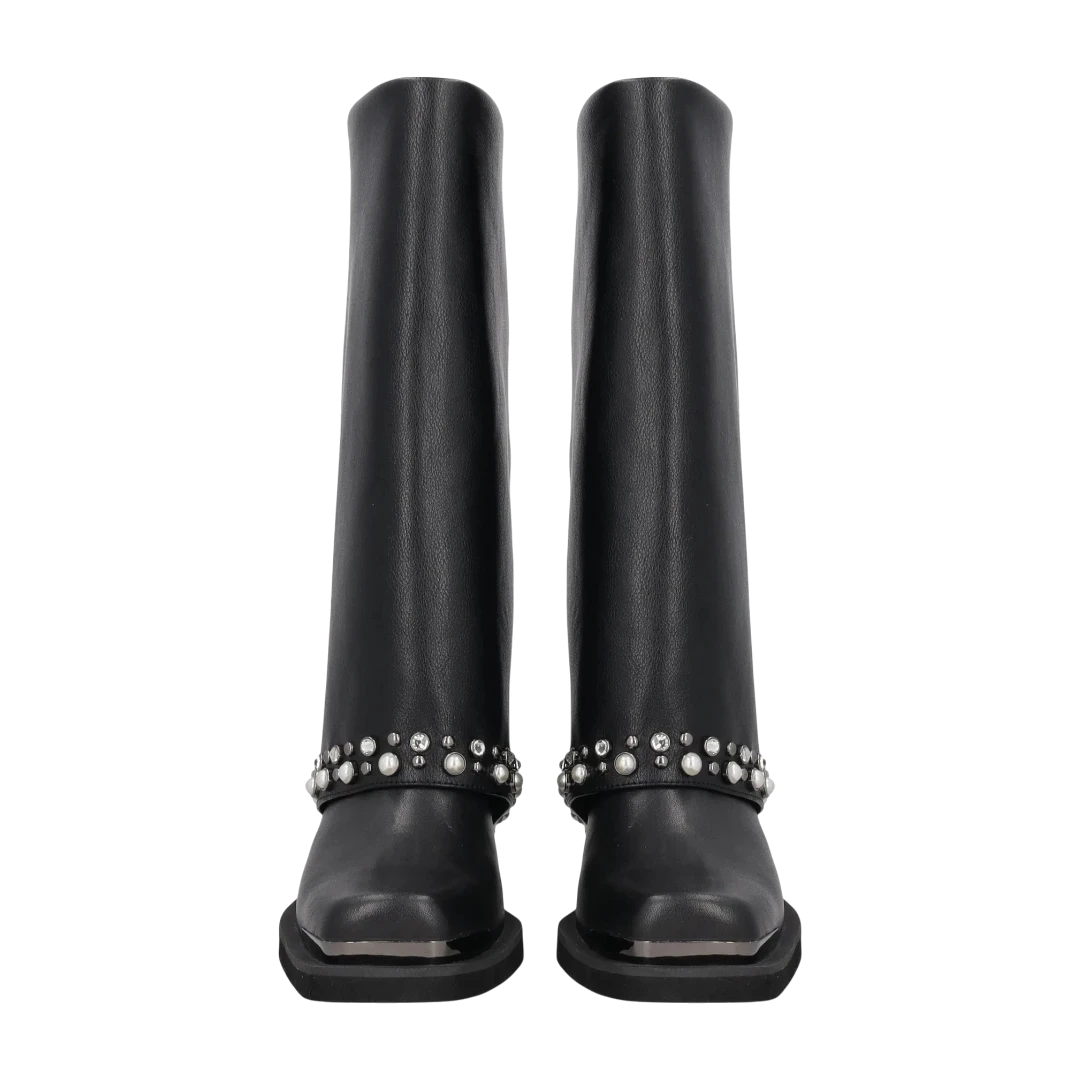 Ove Tosca Blu čizme donose hrabar i luksuzan izgled koji plijeni pažnju. Izrađene od glatke crne kože, ističu se širokom i ravnom cijevi koja elegantno prekriva nogu, dok rubove krase raskošni detalji u vidu bisera i kristala. Četvrtasti vrh i niska potpetica dodaju modernu notu i osiguravaju udobnost pri nošenju. Savršen izbor za žene koje žele statement komad obuće – kombinujte ih uz skinny traperice, mini suknje ili haljine i dobijte stajling koji odiše samopouzdanjem i glamuroznom odvažnošću.