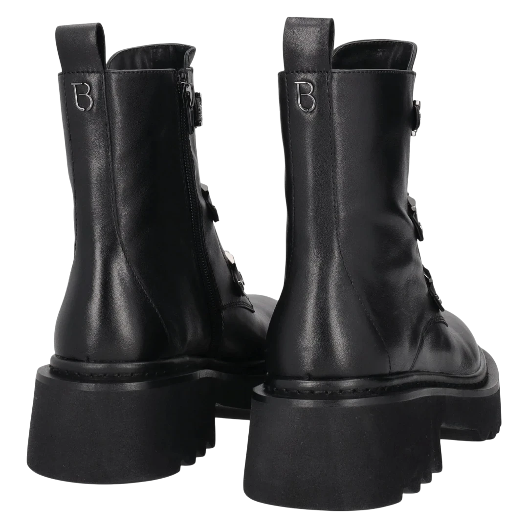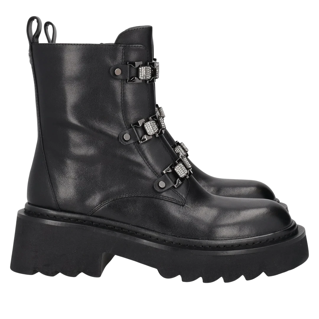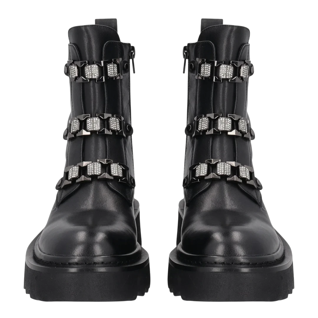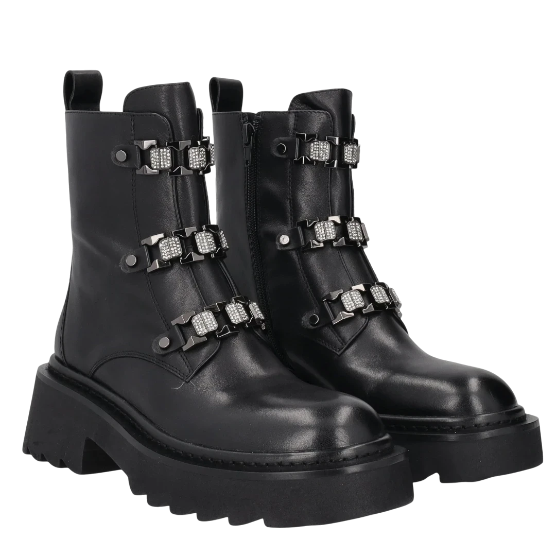 Ove Tosca Blu crne gležnjače predstavljaju savršen balans između urbanog stila i luksuznog detalja. Izrađene od kvalitetne kože, ističu se robusnim zupčastim đonom koji donosi udobnost i stabilnost pri hodu. Posebnu dozu glamura daju metalne kopče ukrašene kristalima, čineći ih efektnim statement komadom koji podiže svaku kombinaciju. Savršene su za moderne dnevne outfite, ali i večernje kombinacije u kojima želite izgledati odvažno i elegantno u isto vrijeme.