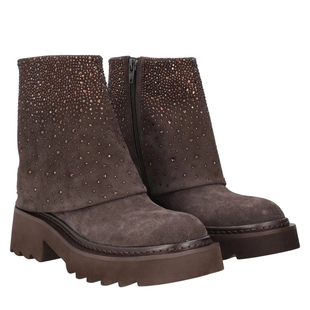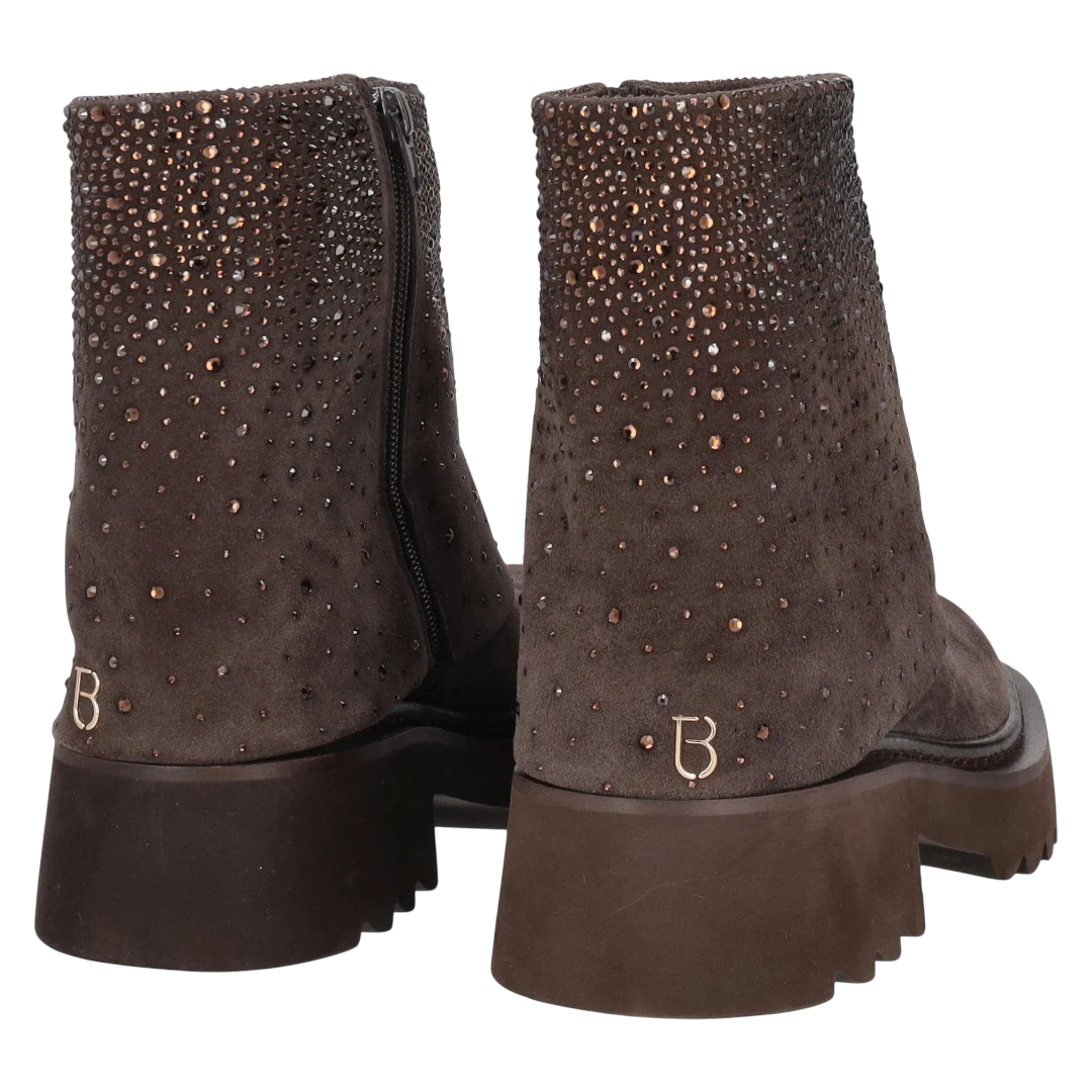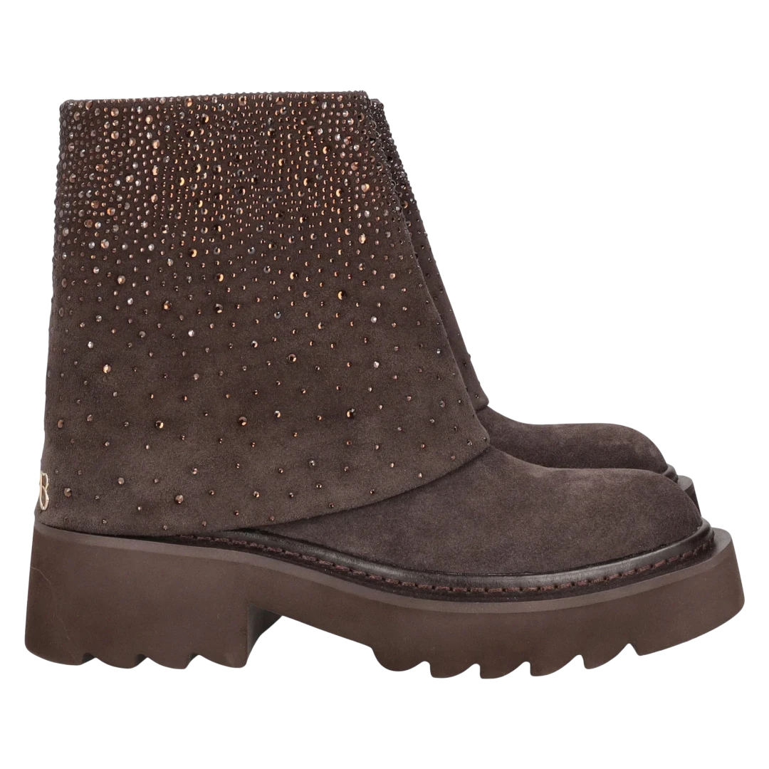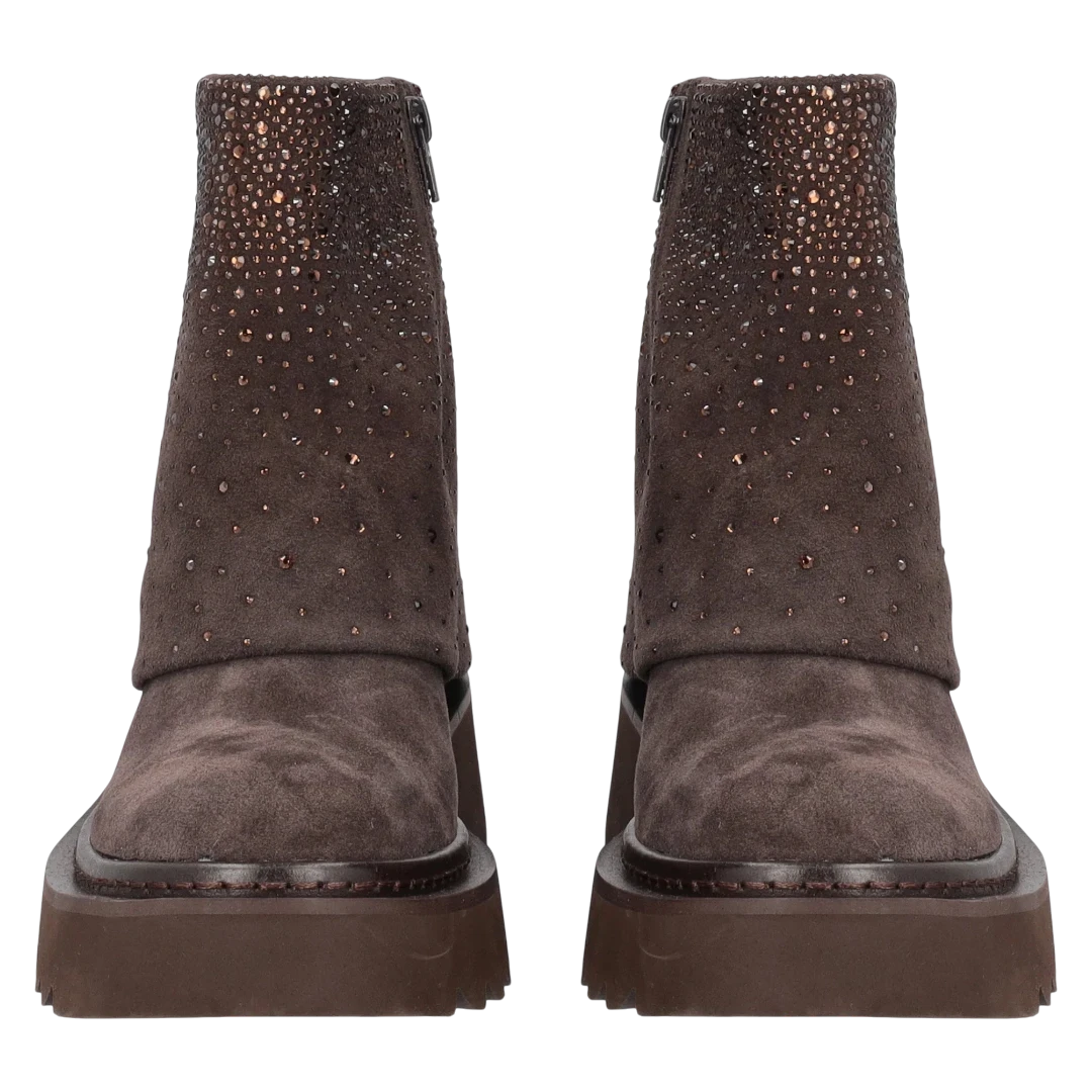 Tosca Blu gležnjače od smeđeg brušenog antilopa odišu luksuzom i elegancijom. Gornjište je ukrašeno sitnim kristalnim aplikacijama koje se presijavaju pri svakom pokretu, dajući im glamurozan izgled. Masivni đon pruža stabilnost i udobnost, dok sofisticiran dizajn čini ovaj model idealnim izborom za moderne kombinacije koje spajaju praktičnost i ženstvenu profinjenost.