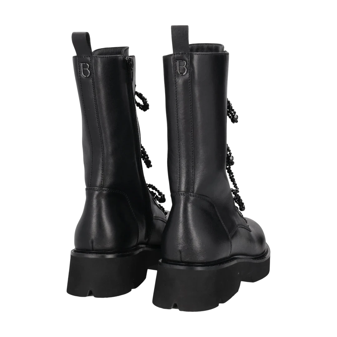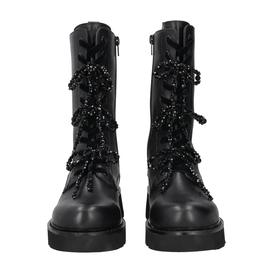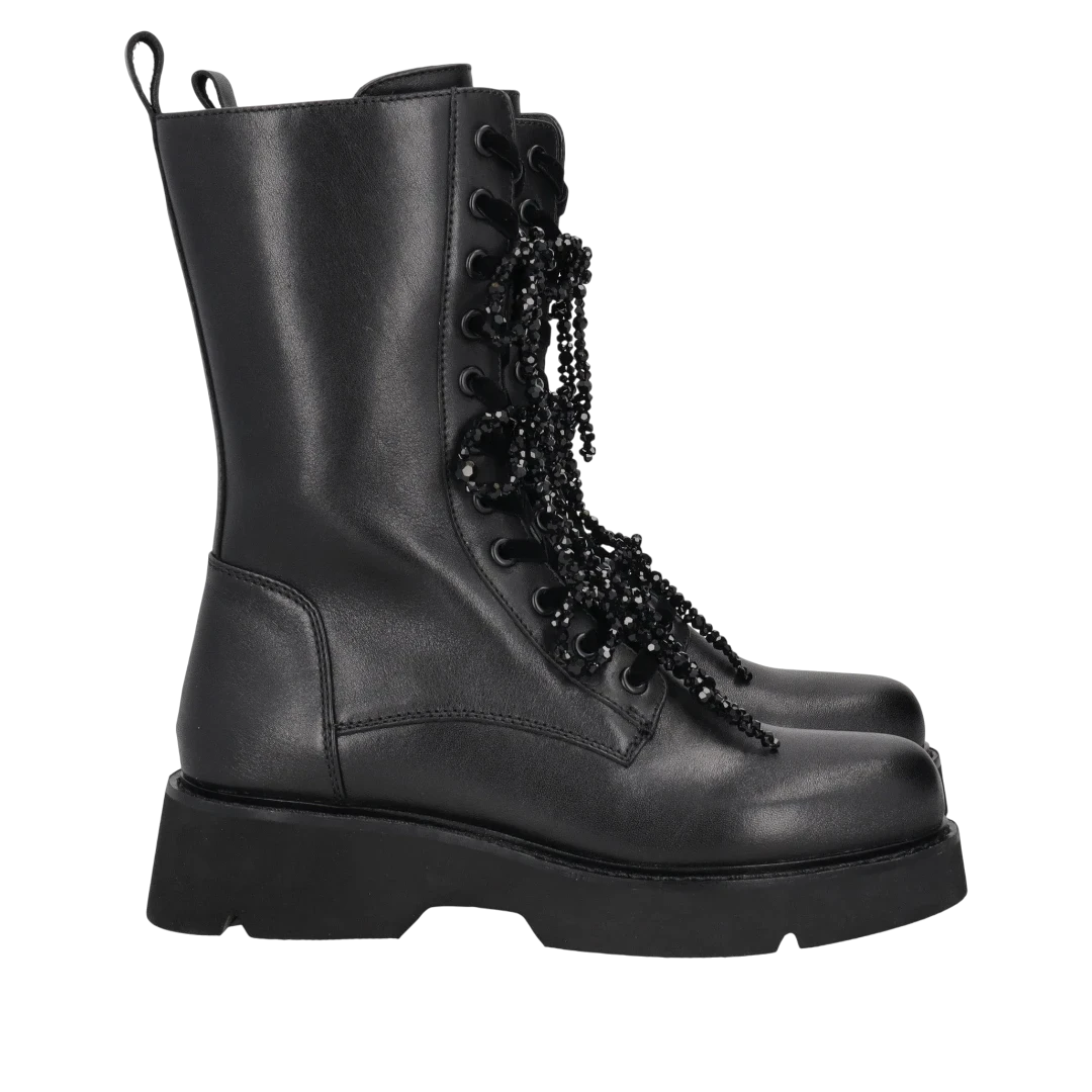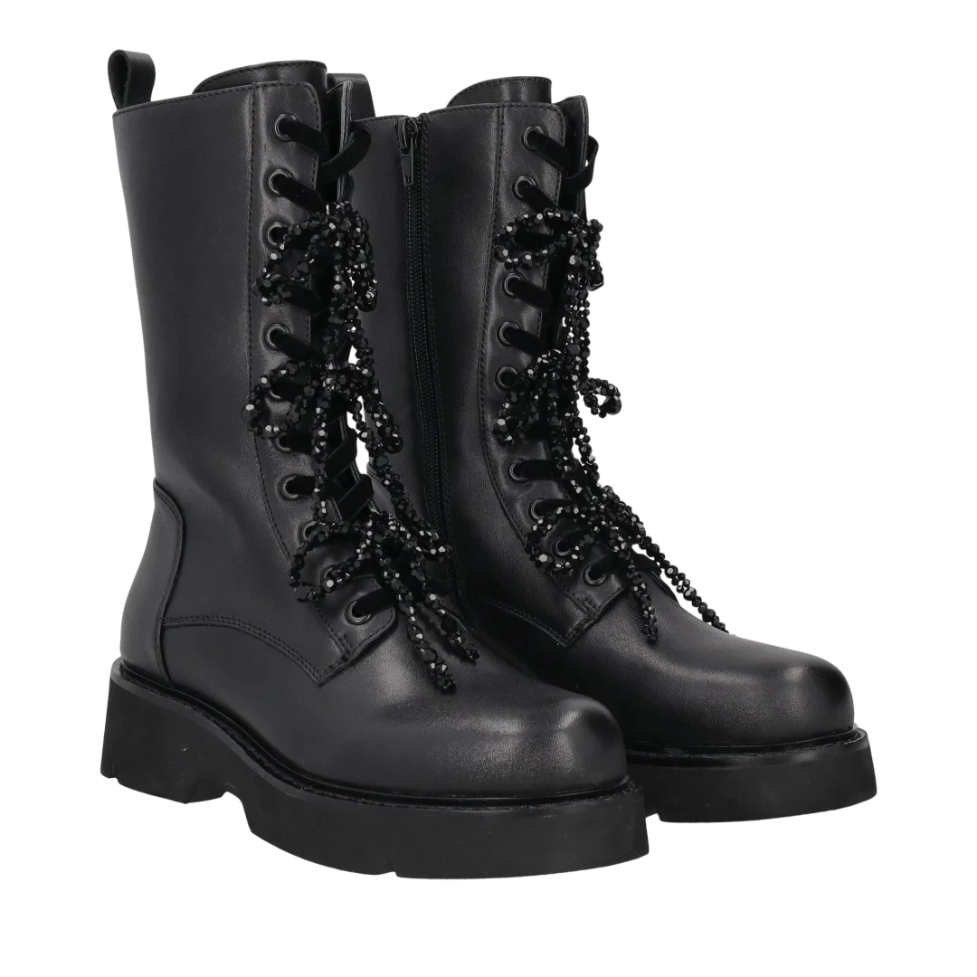 Crne Tosca Blu gležnjače izrađene od fine kože donose moderan i odvažan izgled uz dašak sofisticiranosti. Klasični combat kroj obogaćen je vezicama ukrašenim crnim perlama i kristalima, koje im daju glamurozan, ali istovremeno edgy karakter. Stabilan gumeni đon pruža udobnost i sigurnost, dok elegantna silueta omogućava lako kombinovanje sa urbanim i chic outfitima.
