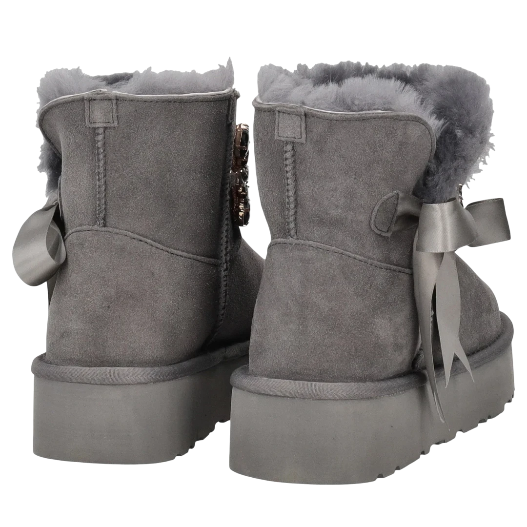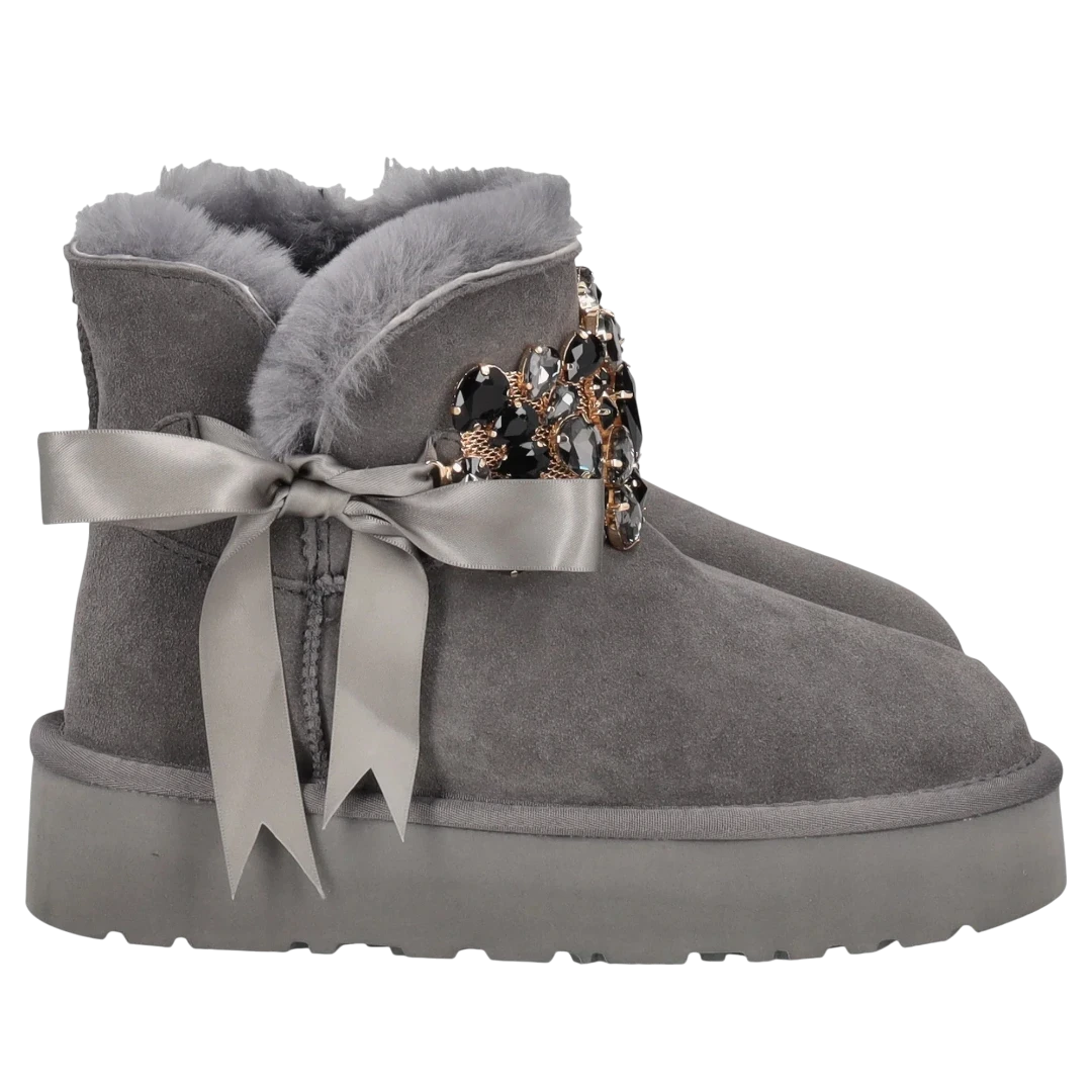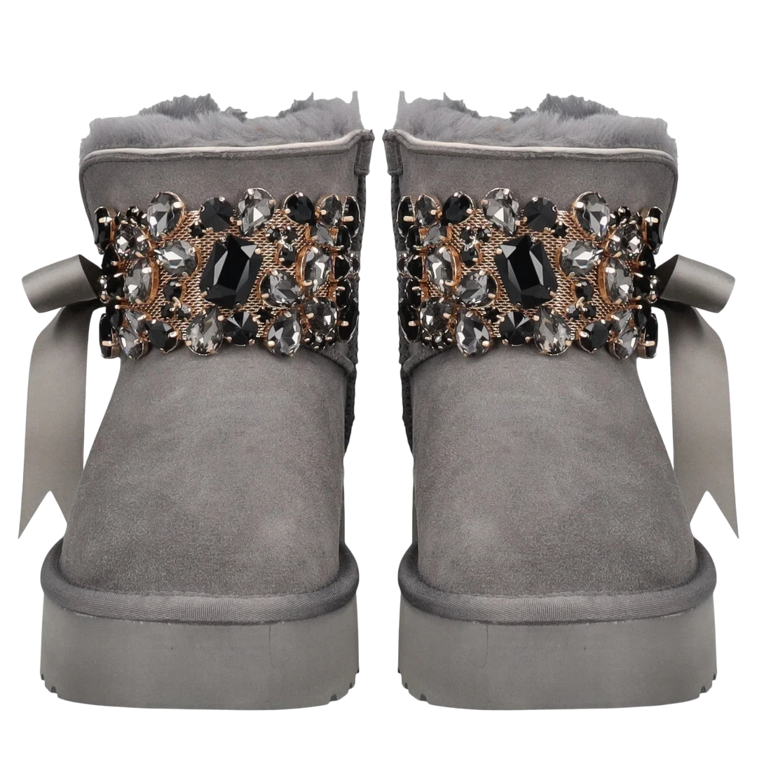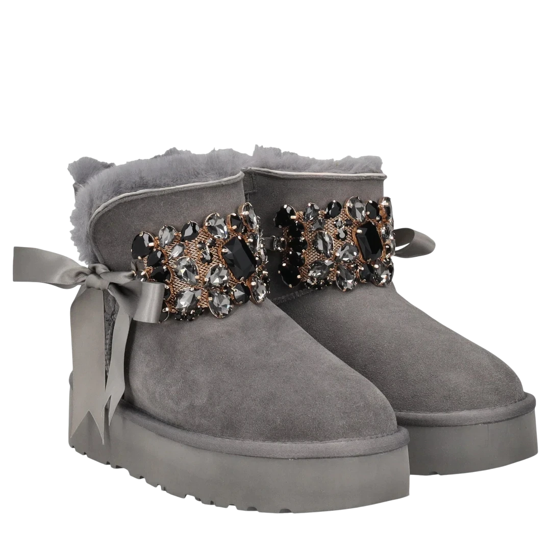 Elegantne Tosca Blu gležnjače u sivom veluru donose savršen spoj udobnosti i luksuza. Topla unutrašnjost od meke postave pruža potpunu udobnost tokom hladnih dana, dok ukrasna mašna i ručno aplicirani kristalni detalji u zlatnim i crnim tonovima daju sofisticiran i glamurozan izgled. Deblji đon osigurava stabilnost i praktičnost, čineći ih idealnim izborom za urbane, modne kombinacije.
