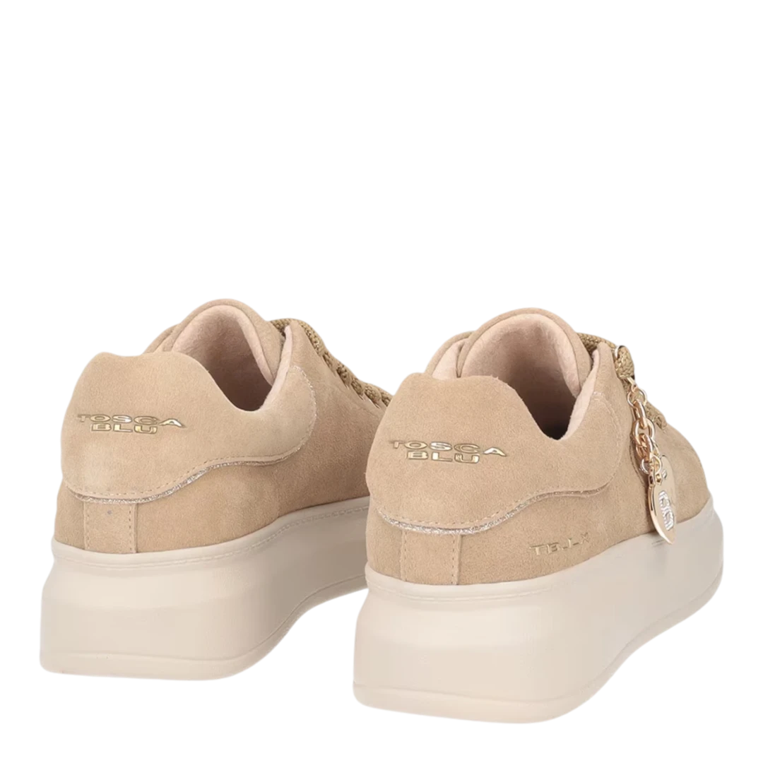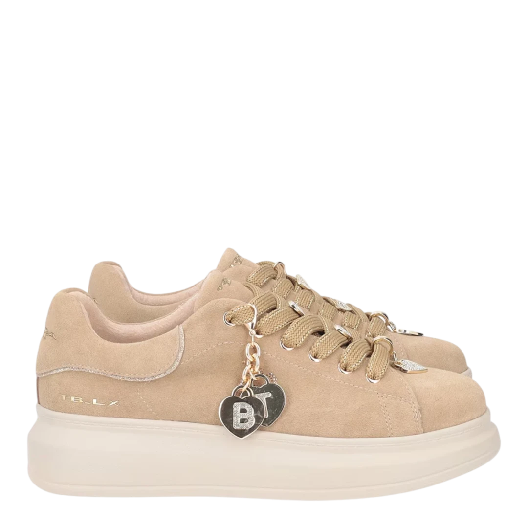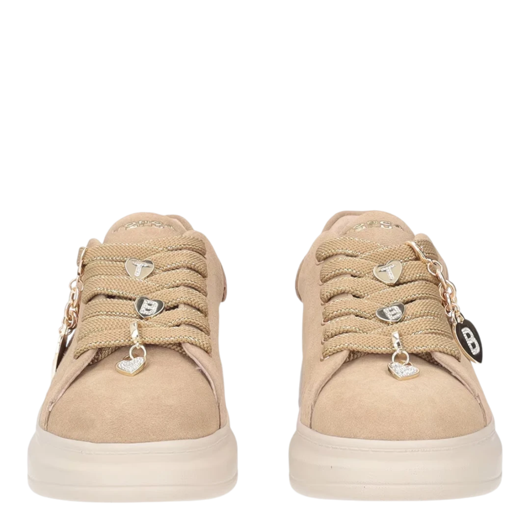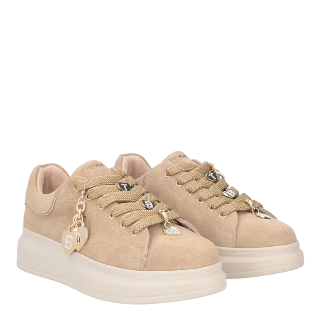 Tosca Blu ženske patike u bež nijansi donose savršen spoj modernog dizajna i udobnosti. Izrađene od kvalitetne glatke kože, ističu se diskretnim TB logotipom na bočnoj strani i metalik zlatnim obrubom na peti koji unosi dašak elegancije. Poseban detalj su ukrasne debele vezice s metalnim završecima i privjeskom u obliku srca sa sjajnim kristalima, što patikama daje luksuzan i ženstven izgled. Lagani platforma đon pruža udobnost i stabilnost, čineći ih idealnim izborom za svakodnevne, ali stilski dotjerane kombinacije.