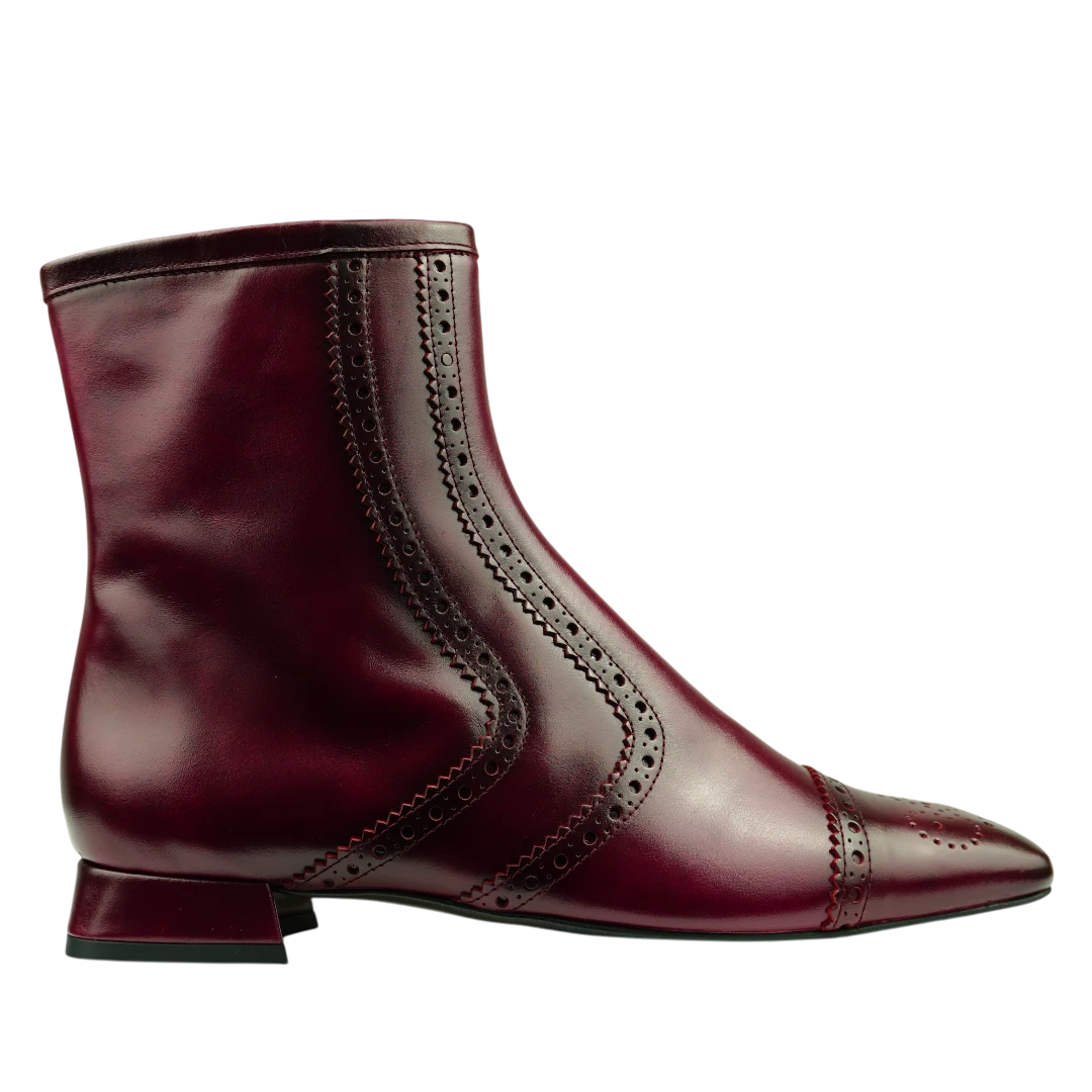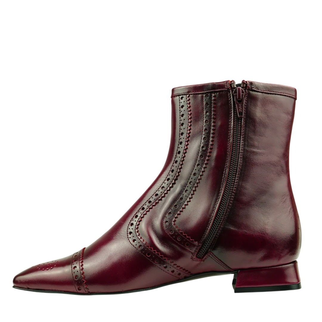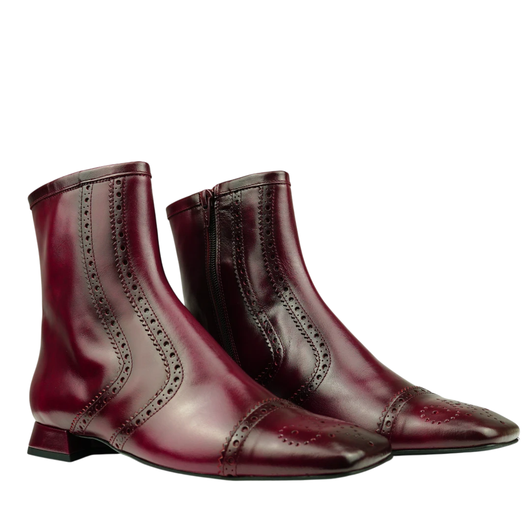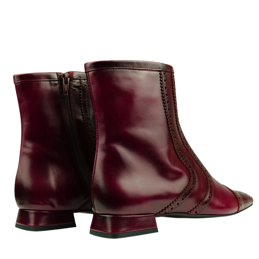 Zinda ženske gležnjače u bogatoj bordo nijansi ističu se luksuznim dizajnom i profinjenim detaljima. Izrađene od visokokvalitetne glatke kože, krase ih dekorativne perforacije inspirisane klasičnim brogue stilom. Diskretni bočni rajsferšlus omogućava lako obuvanje, dok niski stabilni đon pruža udobnost tokom cjelodnevnog nošenja. Ove gležnjače savršeno spajaju eleganciju i savremenu sofisticiranost, idealne su za poslovne kombinacije, večernje izlaske ili kao upečatljiv akcenat u ležernim outfitima.